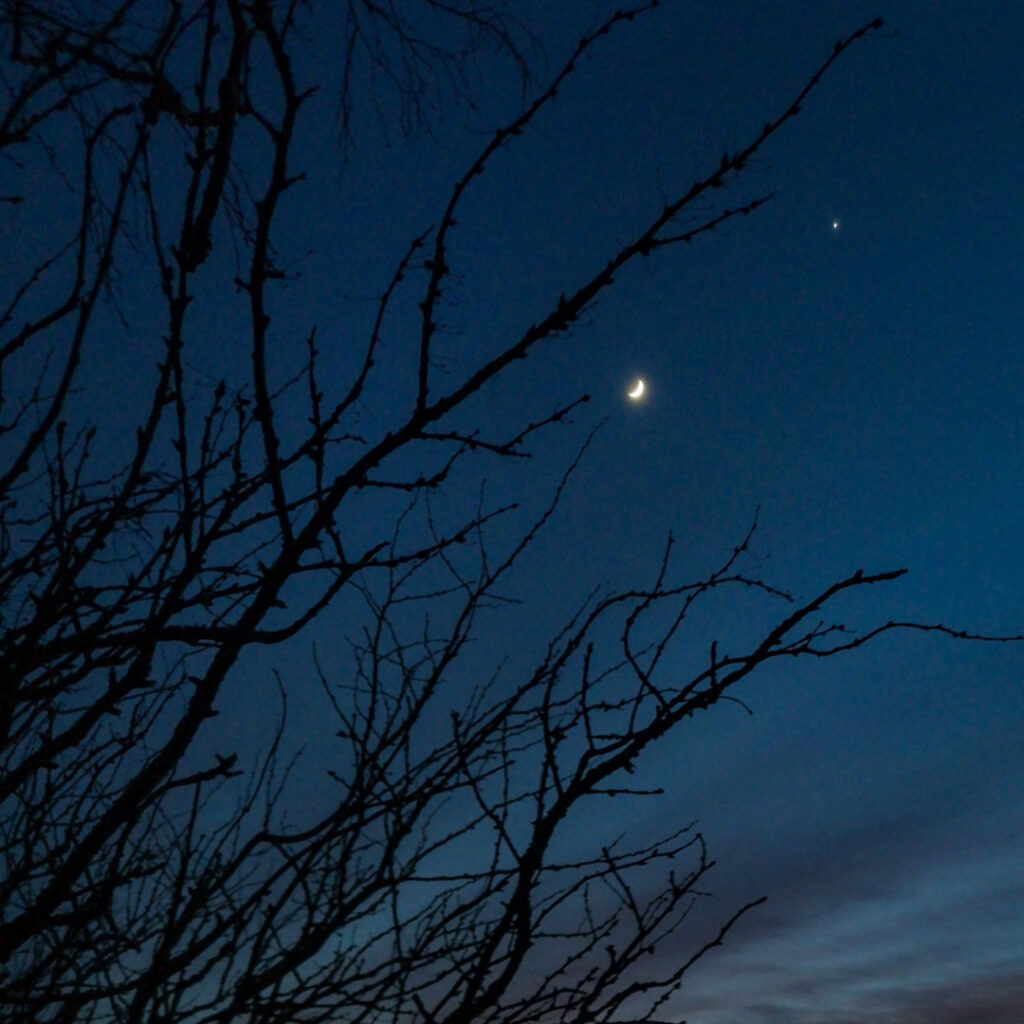Vaihdoin linssin nokalle, tarkensin käsin Venukseen ja käänsin kameran odottamaan kuun nousua. Olin arvioinut muistikuvieni perusteella puuston korkeuden väärin ja joutuisin odottamaan tovin, että kuu ponnistaa puiden latvojen yläpuolelle. Pahus vie. Noh ei hätää, mikäs tässä on seistessä, ajattelin.