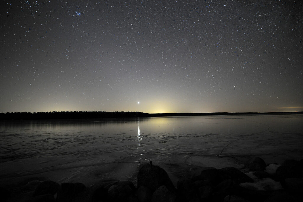 Eläinratavalo mallia Pulkkilanharju. Kuvattu noin klo 20:30, 14mm/2,4, iso 1600, 30s. Alempi kuva noin puolta tuntia myöhemmin eri paikasta. Jään pinnasta erottuu hyvin Venuksen silta.
