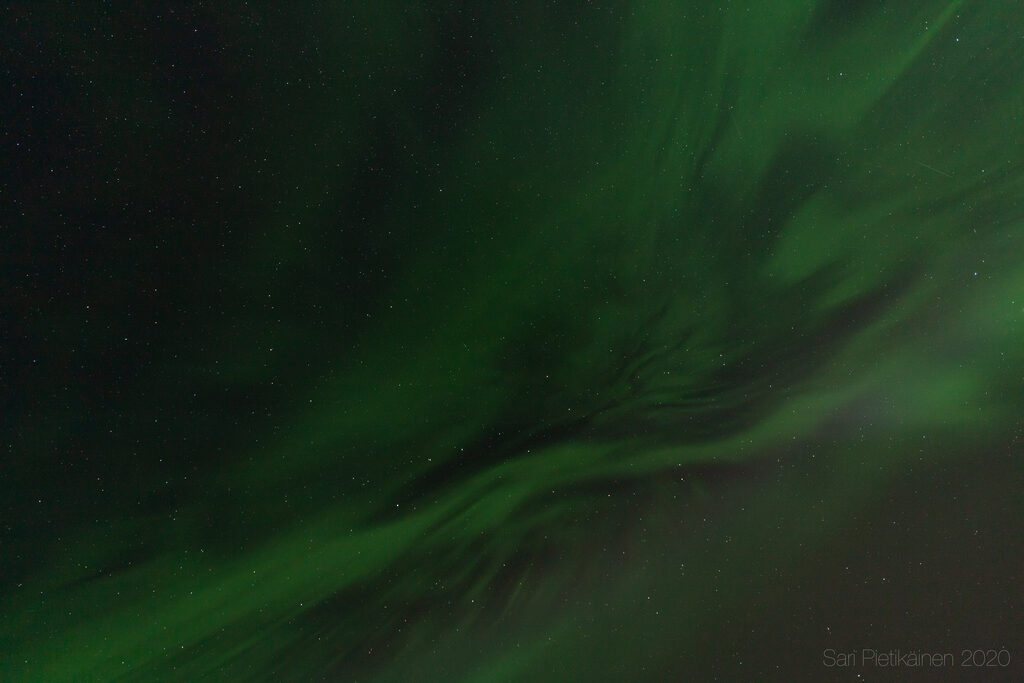Olimme ajamassa kotia kohti, kun kysyin mieheltä näkyykö revontulia taustapeilissä. Seurasi hetken hiljaisuus ja vierestä kuului: ei näy, mutta sivuikkunasta kyllä. Vallitsi hetken hiljaisuus. Siis mitäh? Todellakin. Sivuikkunasta näkyi kirkastunut kaari. Eikun liinat autosta kiinni, pakki päälle ja peruutus lähimpään liittymään. Pääsin pellolle ja sain kopin kauniista ympäristöstä ja kirkkaasta revontulikaaresta.