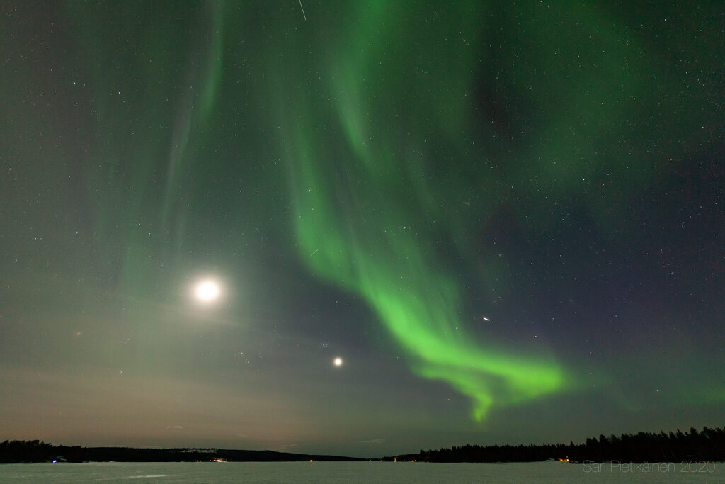 Hups. Väsytti hurjasti edellisen yön kuvaaminen, mutta onneksi viime hetkellä tein päätöksen lähteä pihalle. Kameran akutkin oli osittain lataamatta lähdön hetkellä.. Tulet loimotteli kirkkaana taivaalla jo lähestyessäni lähintä mahdollista kuvauspaikkaa. Siellä oli “yllättäen” muutama muukin samalla asialla ja piti ihan parkkipaikkaa etsiä ennenkun pääsin asiaan. Enpä ole tälle kaudelle tämmösiä reposia nähnyt.Koko ajan tapahtui monessa suunnassa, niin ettei tiennyt mihin ois kameran suunnannut. Kuu ja Venus toivat kuvaamiseen omat haasteensa, mutta itse tykkään niistä, vaikka ne tulilta vähän tehoa vievätkin kuvissa.