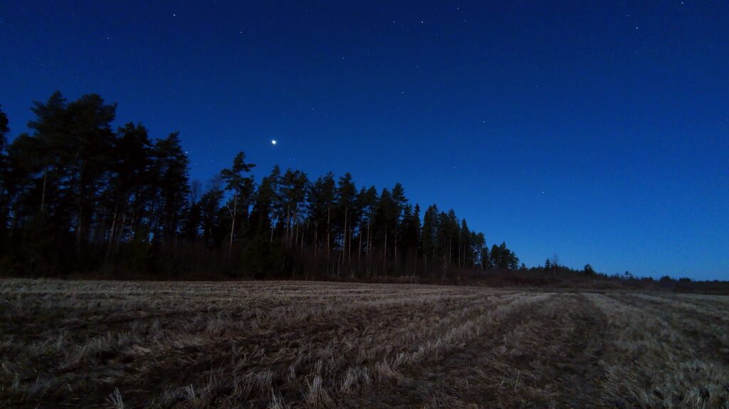 Perille päästyäni seurasin taivaan tummumista ja tähtien syttymistä yksi toisensa jälkeen. Lopulta keräsin tavarat kantoon ja lähdin tarpomaan keskelle peltoa.