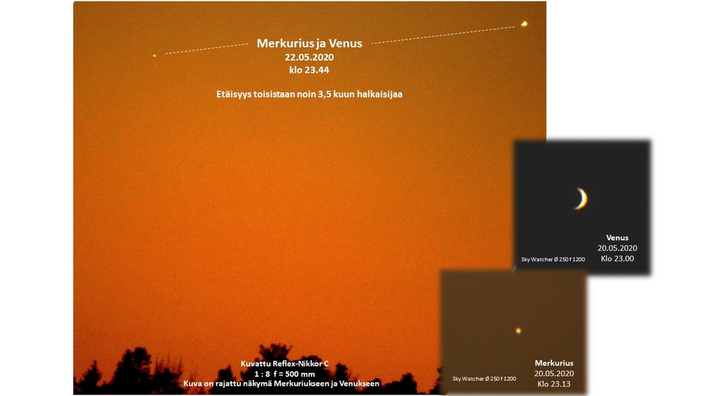 Merkurius ja Venus kuvattuna 22.5.2020 klo 23.30. Nikon D7000, 105 mm, aukko f/5,6, 10/25 s., ISO: 160. 22.5.2020 klo 23.30. Kuva: Veikko Mäkelä.