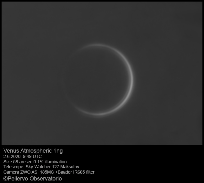 Lopputuloksena oheinen kuva Venuksen kaasukehän renkaasta, videolta tuota ei erota kokonaisena, pinotussa kuvassakin erottuu vaivoin. Venuksen etäisyys Auringosta kuvaushetkellä oli 2 astetta”