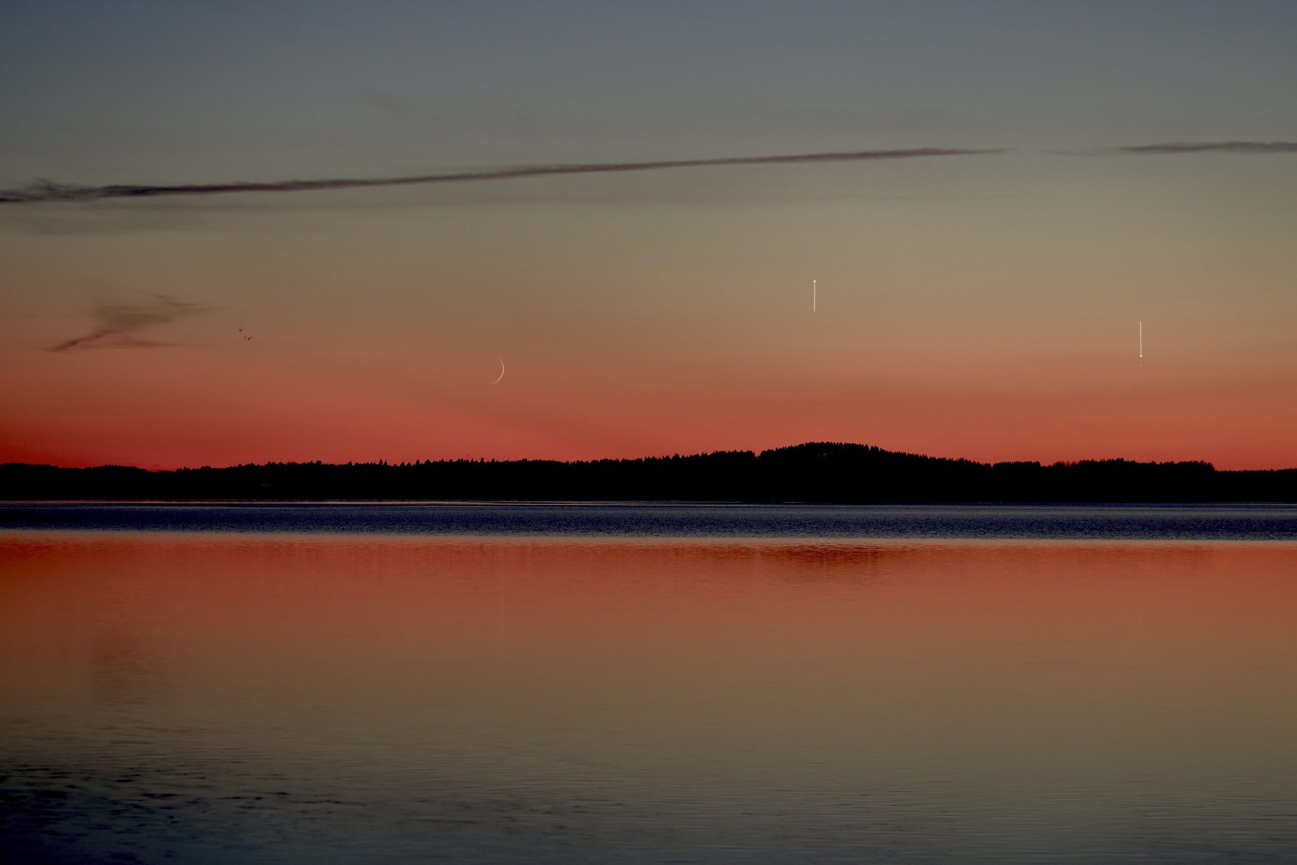”Sää oli mitä mainioin, näkyvyys lähes taivaanrantaan, ei tuulta, ei hyttysiä. Niin ja olihan tässä myös nätti maisema, tyyni järven pinta, kalat kävivät kurkkimassa mitä tapahtuu, joutsen lipui ohitse ja kevätyö oli mitä parhain. Enkä löytänyt Merkuriusta paljain silmin, vaikka tasan tarkkaan tiesin, missä sen pitäisi olla Kuun ja Venuksen välissä. Ja kun alkoi hämärtää hieman enemmän, niin kolmikko oli painunut jo varsin alas. Mutta sieltähän Merkurius onneksi löytyi kuvasta.”