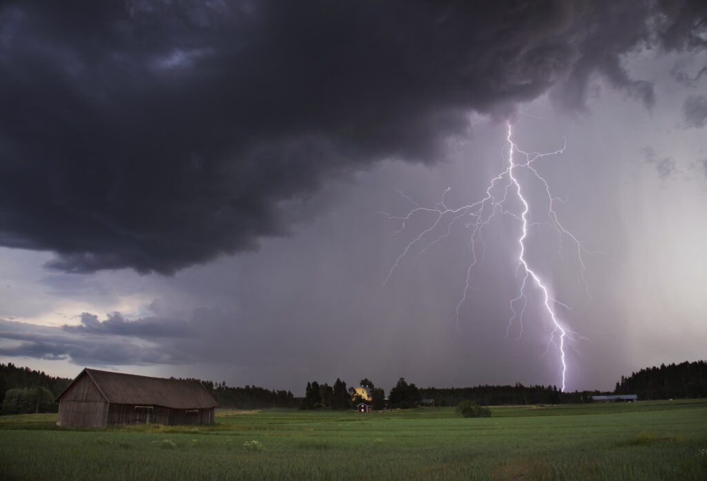 Ukkospilvi oli onneksi melko hidasliikkeinen, joten pääsin uudestaan sen edelle. Taas kerran juoksin kameran ja jalustan kanssa pellon sivuun. Pilvi salamoi yhäti taajaan. Asetin kameran kohti jyrisevää hirvitystä ja sitten pamahti.