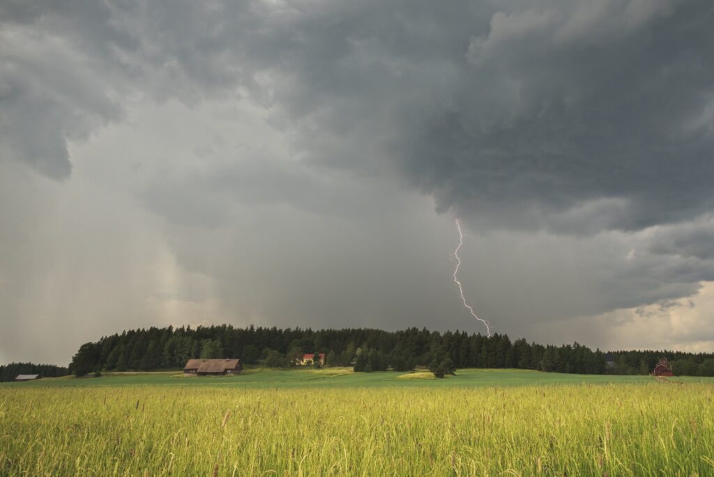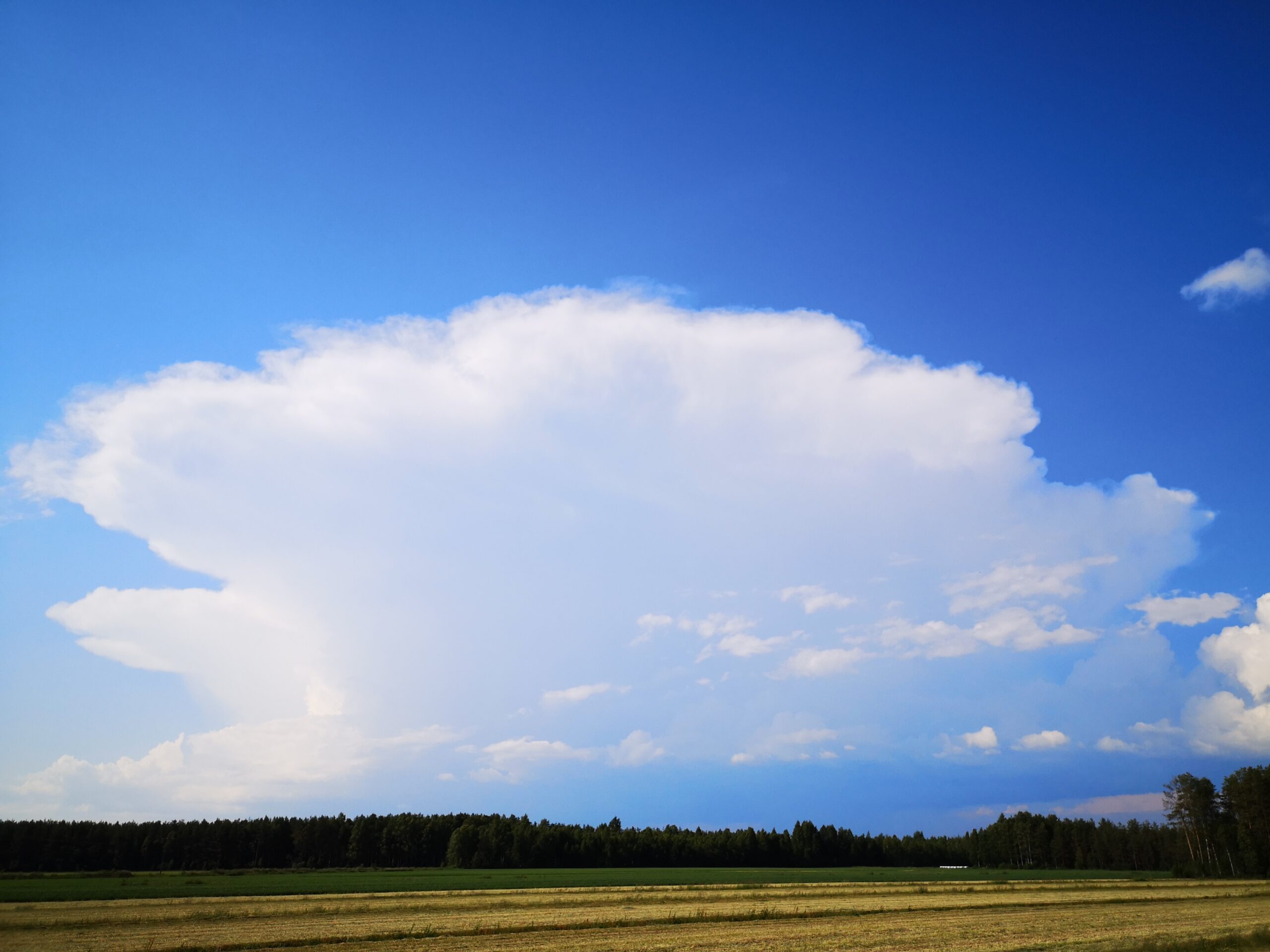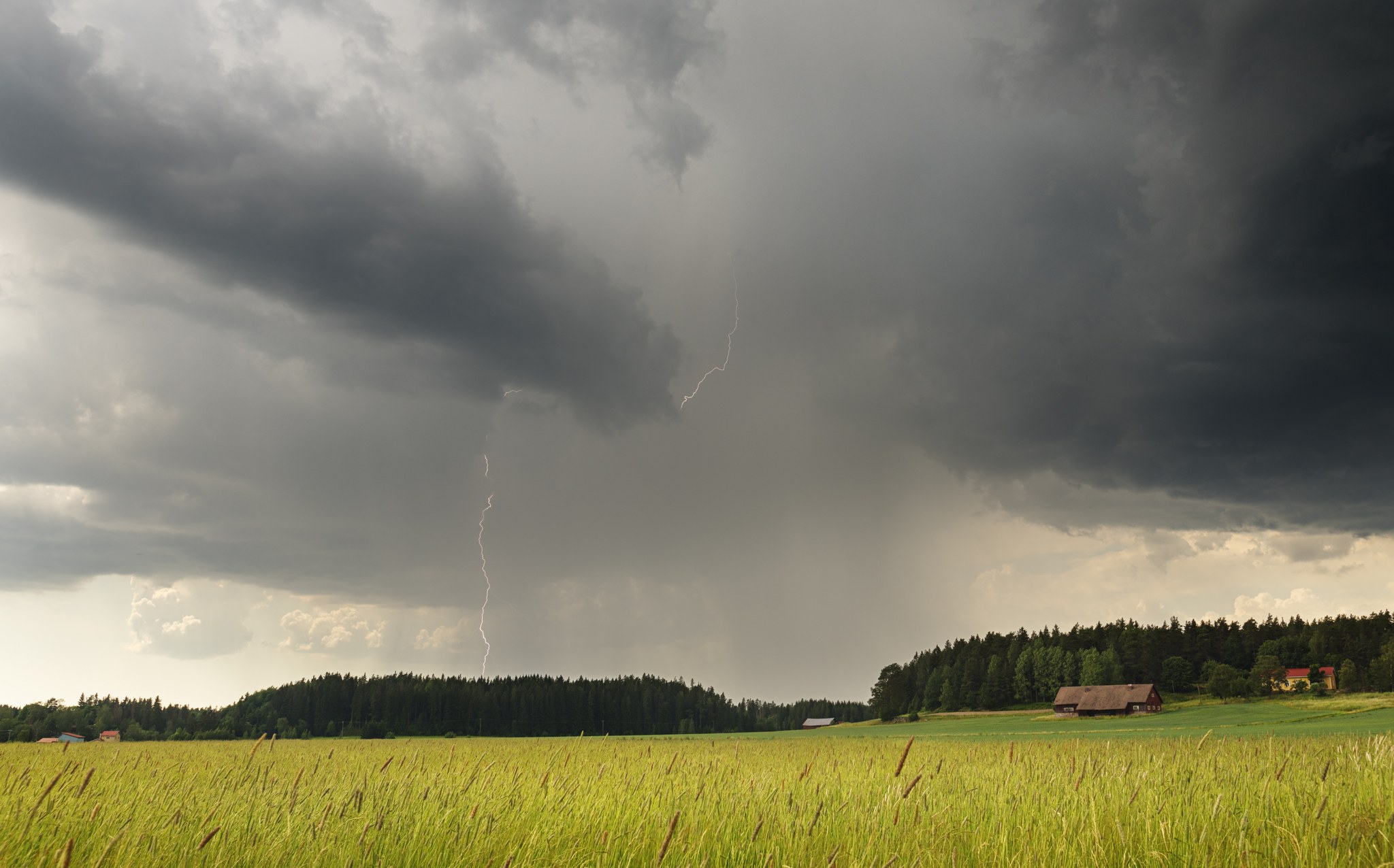 Nappasin lasillisen vettä ja hyppäsin takaisin autoon. Jos ukkossolu näytti sadetutkassa hyvältä, luonnossa se oli mahtava. Kuin musta sienipilvi. Ajoin auton traktoripolun päähän ja kiiruhdin kameran kera pellolle.