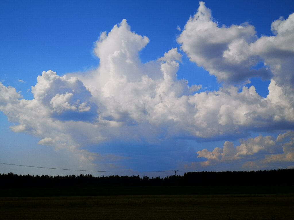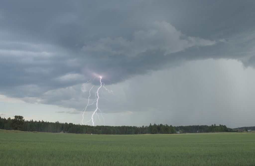 Sunnuntaiaamu kului kotitöitä tehdessä ja taivasta tarkkaillessa. Oli kuuma, jälleen. Ilma oli, jos mahdollista, hiostavampi kuin edellisenä päivänä. Merituuli auttoi kehityksessä ja kohta taivaalle alkoi nousta korkeita kumpupilviä. Seurasin sade- ja salamakarttoja kuumeisesti. Hieman ennen kahta iltapäivällä ensimmäiset salamat rekisteröityivät karttaan. Lähdin lähipellon reunaan. Siellä näkyikin komea, musta pilvi, joka välkkyi harvakseltaan. Seurasin hetken pilven kulkua ja totesin, että tuon perään en lähde. Sen kulkusuunta oli haastava, eikä pilven elinajasta ollut varmuutta. Päätin odotella, josko uusia ukkossoluja syntyisi paremmalle paikalle.