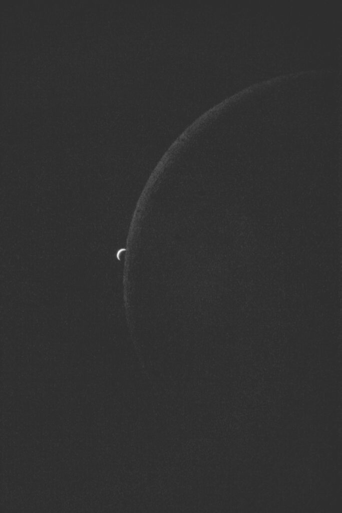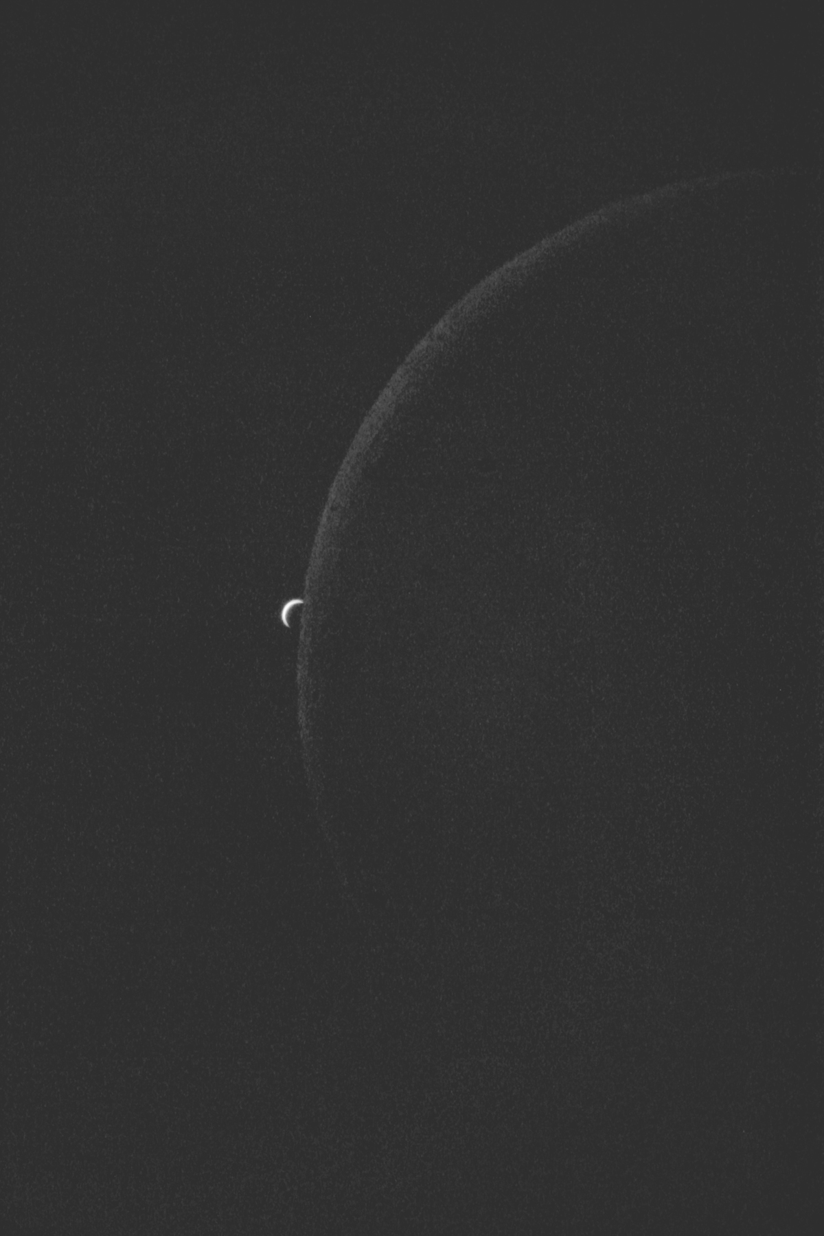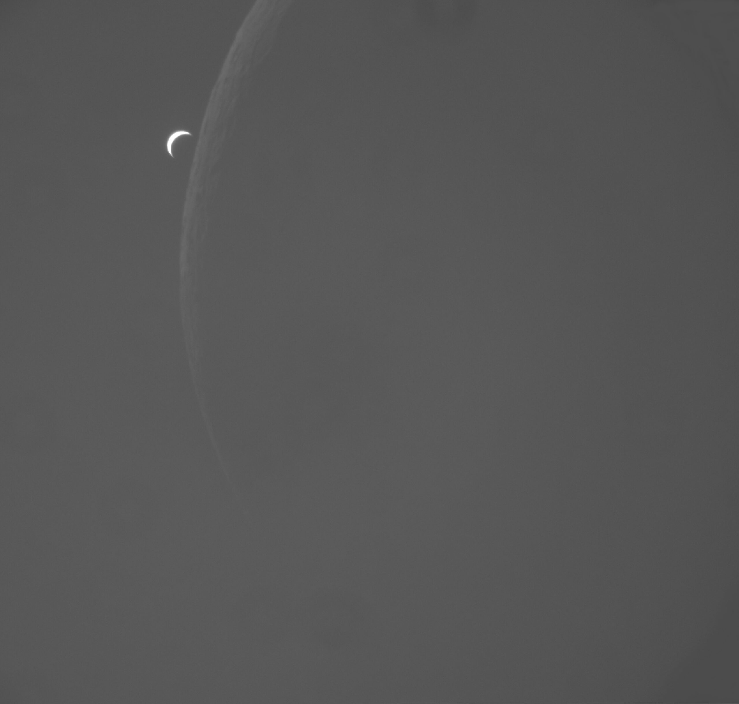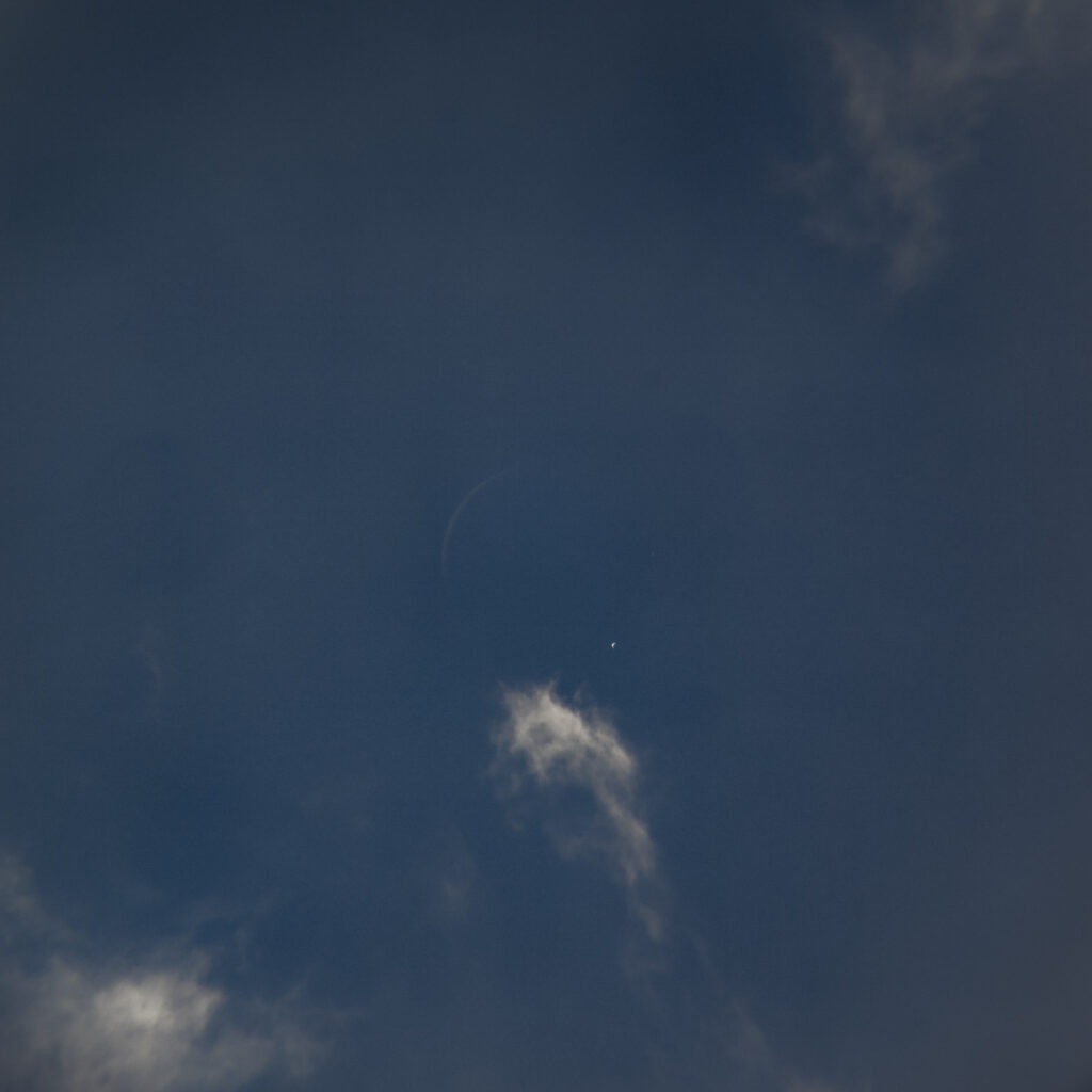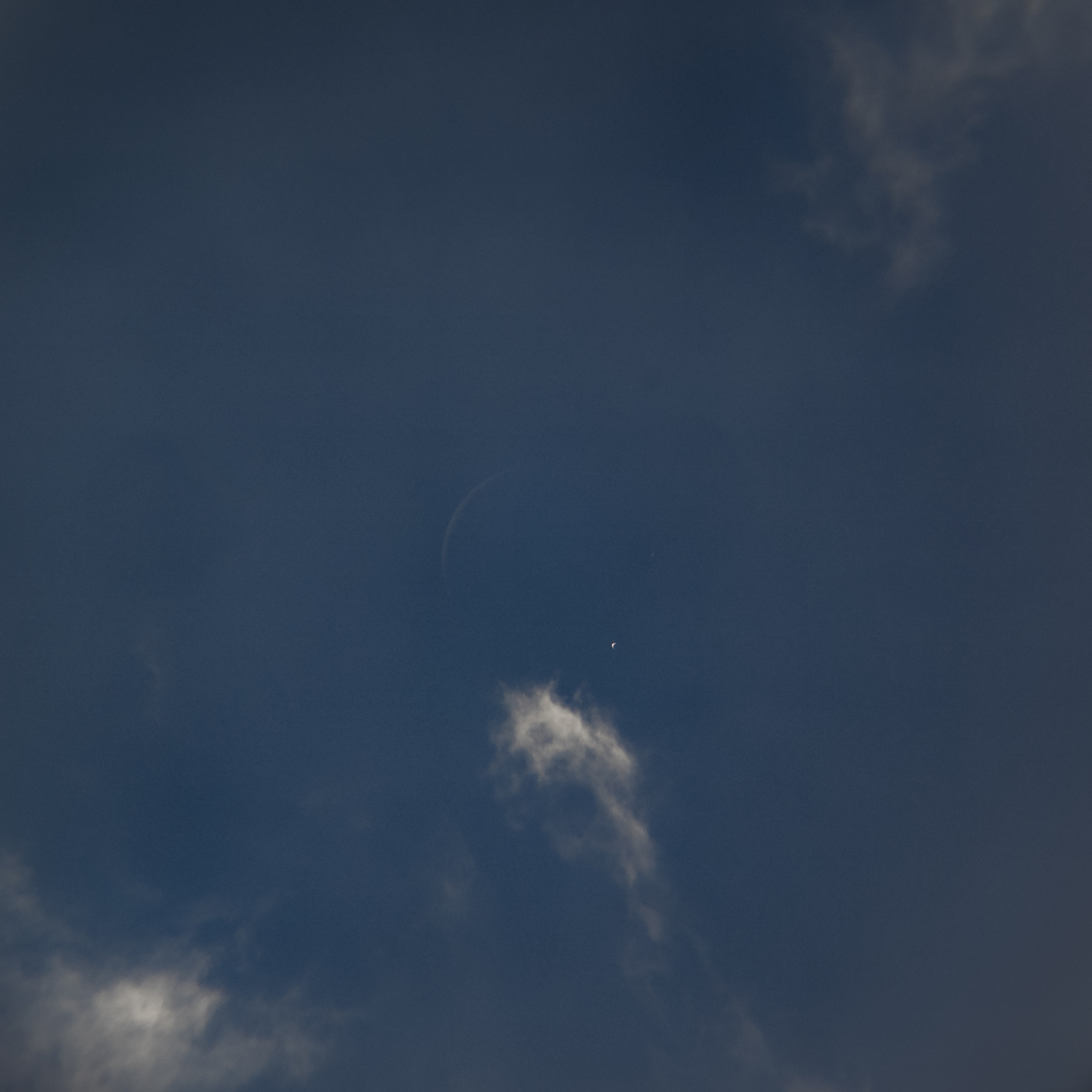 Siilinjärvellä Janne Voutilaista haittasivat pilvet, joissa oli onneksi rakoja. Venus peittyi pilvien taakse. Janne oli ainoa, joka havaitsi peittymistä Venuksen esiintulon jälkeen. Kuvatiedoston nimi kertoi esiintulon tapahtuneen klo 12.33.11. Laskujeni mukaan Venuksen piti tulla Siilinjärvellä esiin klo 12.26.10. Kuvassa näkyy pilven hattaroita sekä Venuksen sirppi Kuun pimeän reunan lähellä.