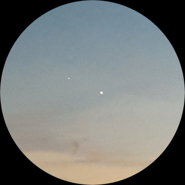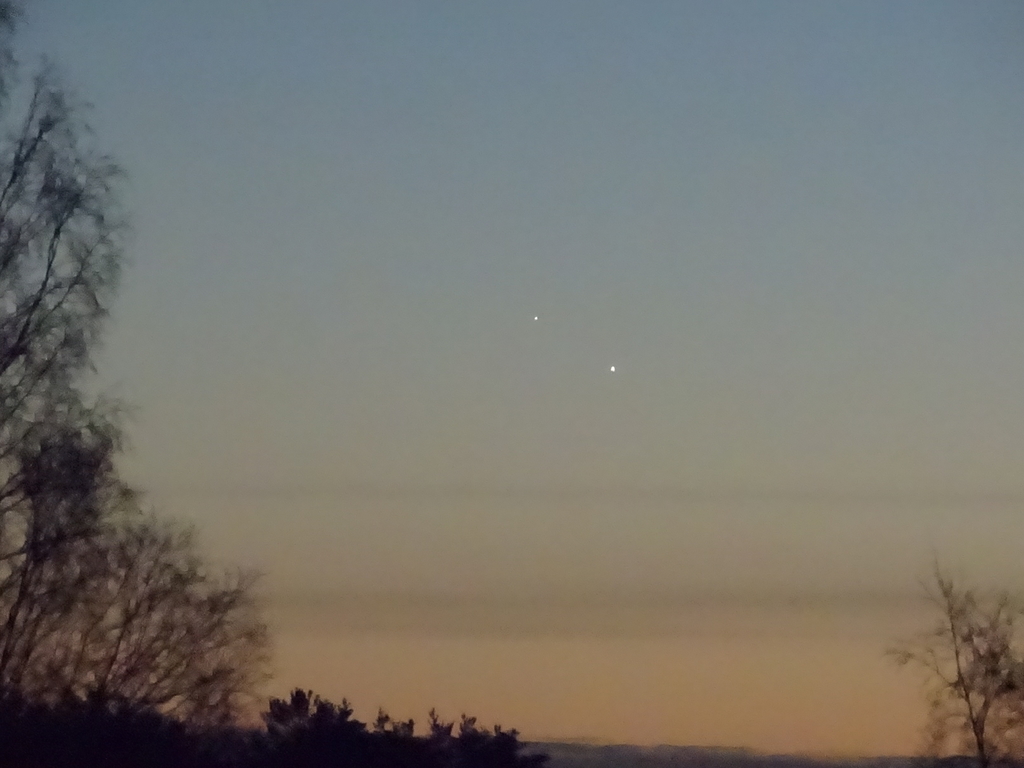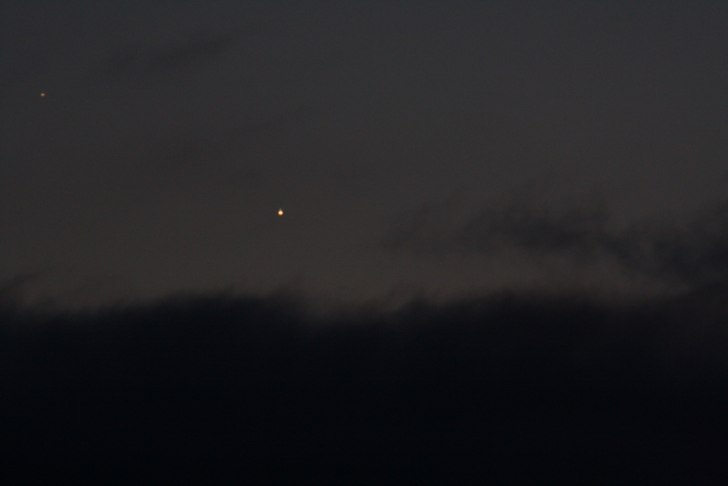 Planeetat olivat toisistaan puolen asteen (eli yhden Kuun läpimitan verran) etäisyydellä torstaina 17.12. Lupaavasti näytti siltä, että jo varsin lähekkäin olevat planeetat voisikin nähdä taivaalla! Eteläisesssä Suomessa pilvipeite hetkiseksi rakoili päivällä, mutta ilo jäi lyhytaikaiseksi. Sen sijaan pohjoisemmasta Suomesta havaintoja saatiin.