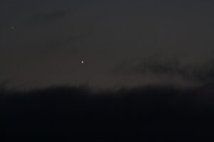 Jupiter ja Saturnus kurkkasivat pilvenraosta Mäntyharjulla jouluaattona kello 16.43. Kamera Canon EOS 1100D, 55 mm, aukko f/5,6, valotusaika 1 s, ISO 800. Kuva: Markku Siljama.