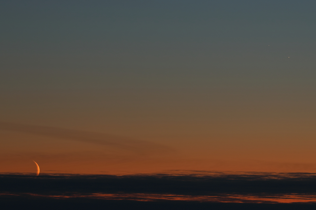Hetkellisen selkenemisen myötä sai lähestyvää kohtaamista kuvattua myös Jouni Ikonen Muhoksen taivaalta. Mukaan pääsi myös laskemassa oleva Kuu tuomaan mittakaavaa. Planeettakaksikko on kuvassa mukavasti oikeassa yläreunassa.