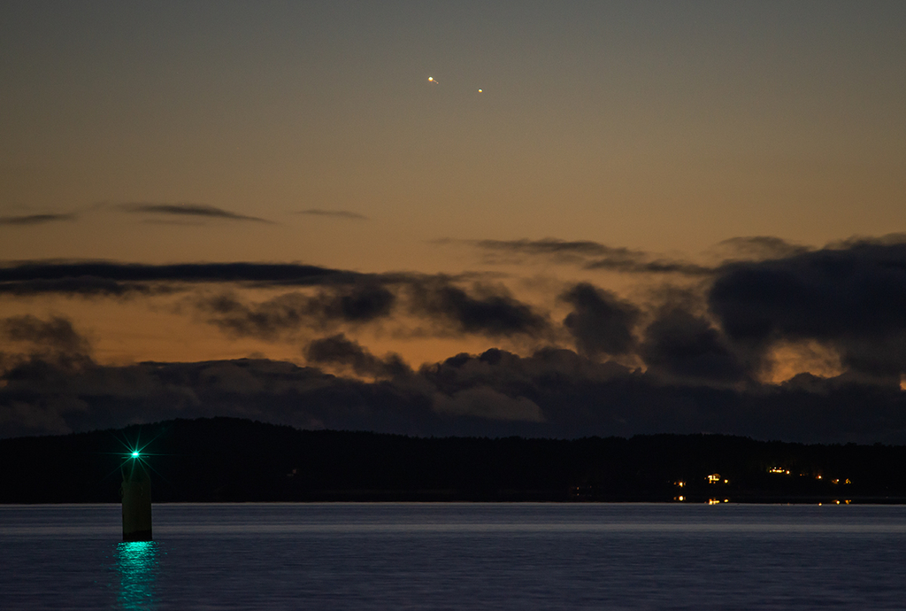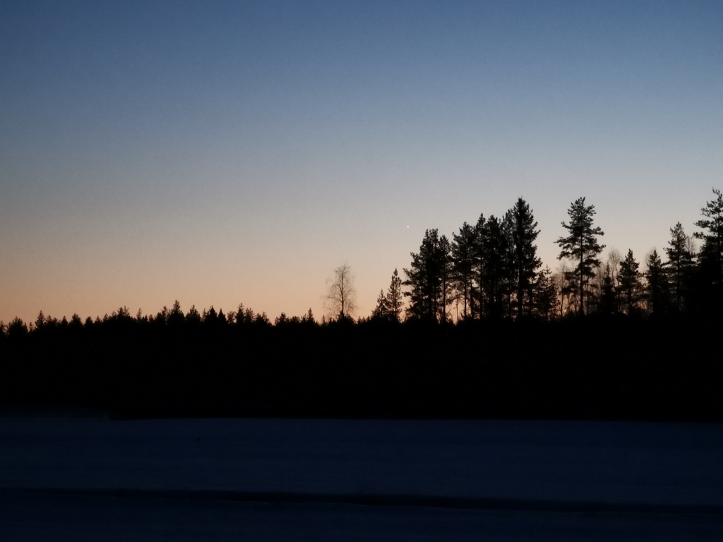 Planeettakaksikko Viikinrannan taivaalla Helsingissä 8.12. 2020 kello 16.45 . Kamera: Nikon D7000, 90 mm, aukko f/8, 6 s, ISO 400. Kuva: Veikko Mäkelä.