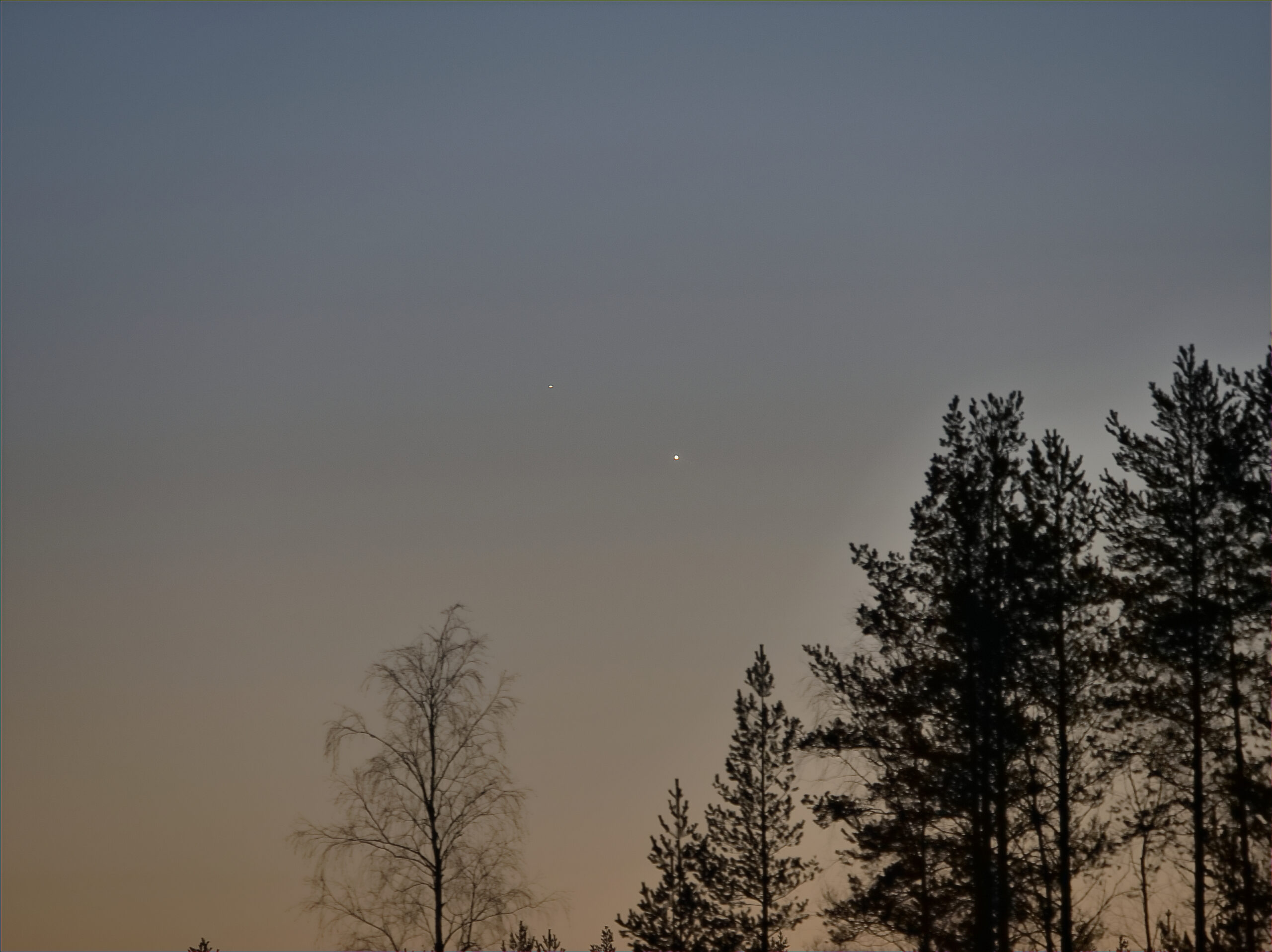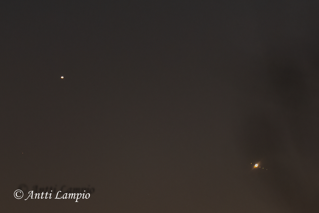 Jupiteria ei kirkkautensa vuoksi voinut olla heti huomaamatta paljain silmin, mutta Saturnus oli huomattavasti hankalampi. Onnistuin kuitenkin senkin näkemisessä, kun tajusin planeettojen olevan toisistaan noin täysikuun mitan päässä. Kuvassa planeetat muodostivat hienon parin Etelä-Järvenpään horisontin ylle.