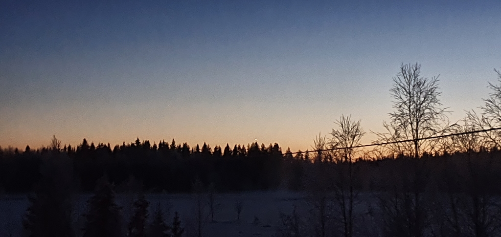 ”Kaksi jättiläisplaneettaa, Jupiter ja Saturnus, lähestymässä toisiaan aurinkokunnan toisella puolella. Klo 16 aikoihin alkoi näkyä Jupiter pienenä pisteenä ja puolta tuntia myöhemmin selvästi.