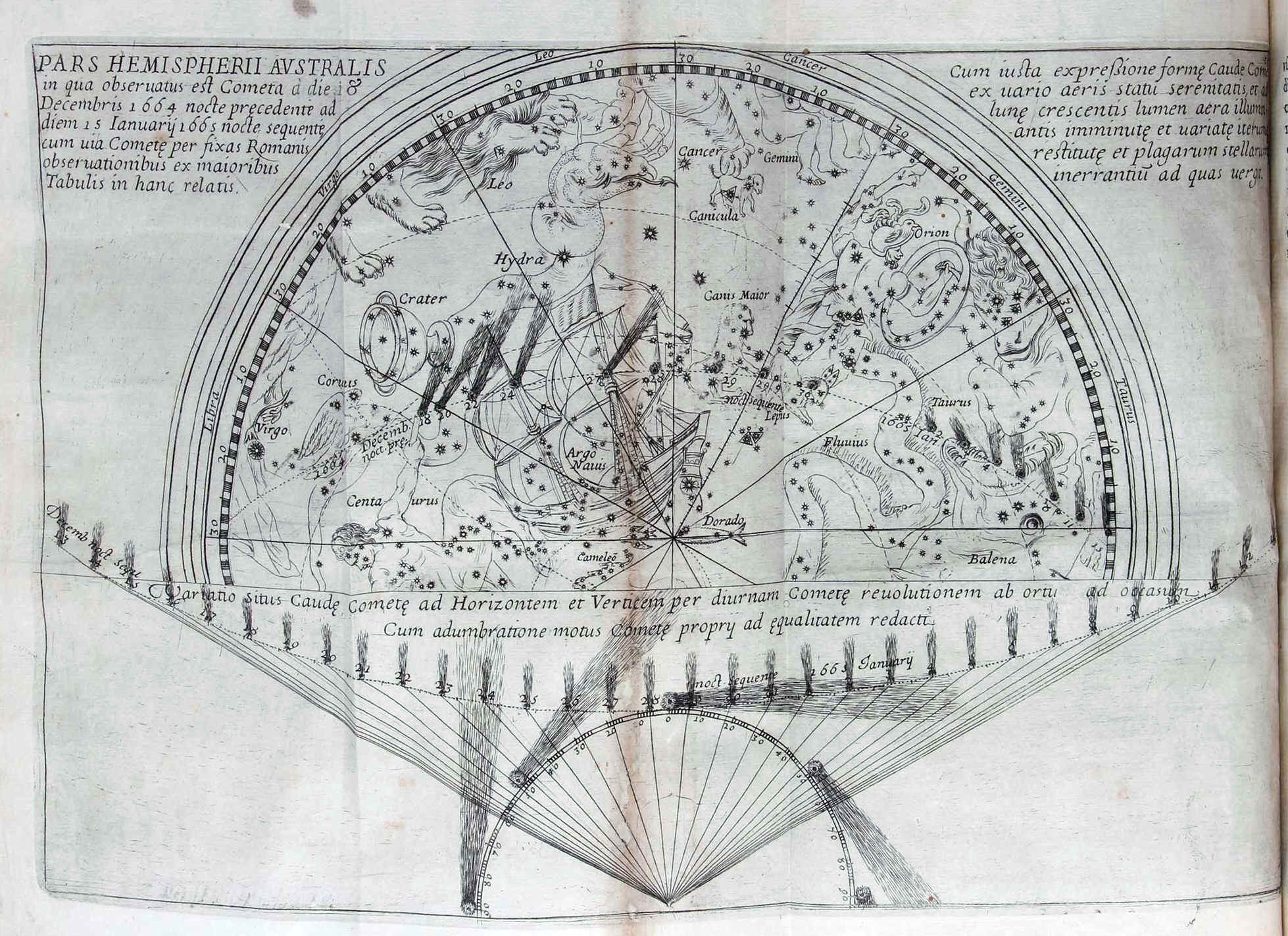 Cassini kirjoittaa muistelmissaan, että Roomassa ollessaan vuoden 1664 lopussa Korpin tähdistöön ilmestyi komeetta, ja hänen elämäänsä uudestaan kuningatar Kristiina. Pyrstötähteä Giovanni Domenico havaitsi säännöllisesti Chigin palatsista. Vuoden 1664 komeetan, ja myös vuonna 1665 ilmestyneen pyrstötähden Cassini merkitsi karttaansa pienillä lyijypisaroilla. Säännölliset havainnot olivat peruste efemerideille ja Cassinin teorialle komeettojen liikkeistä.