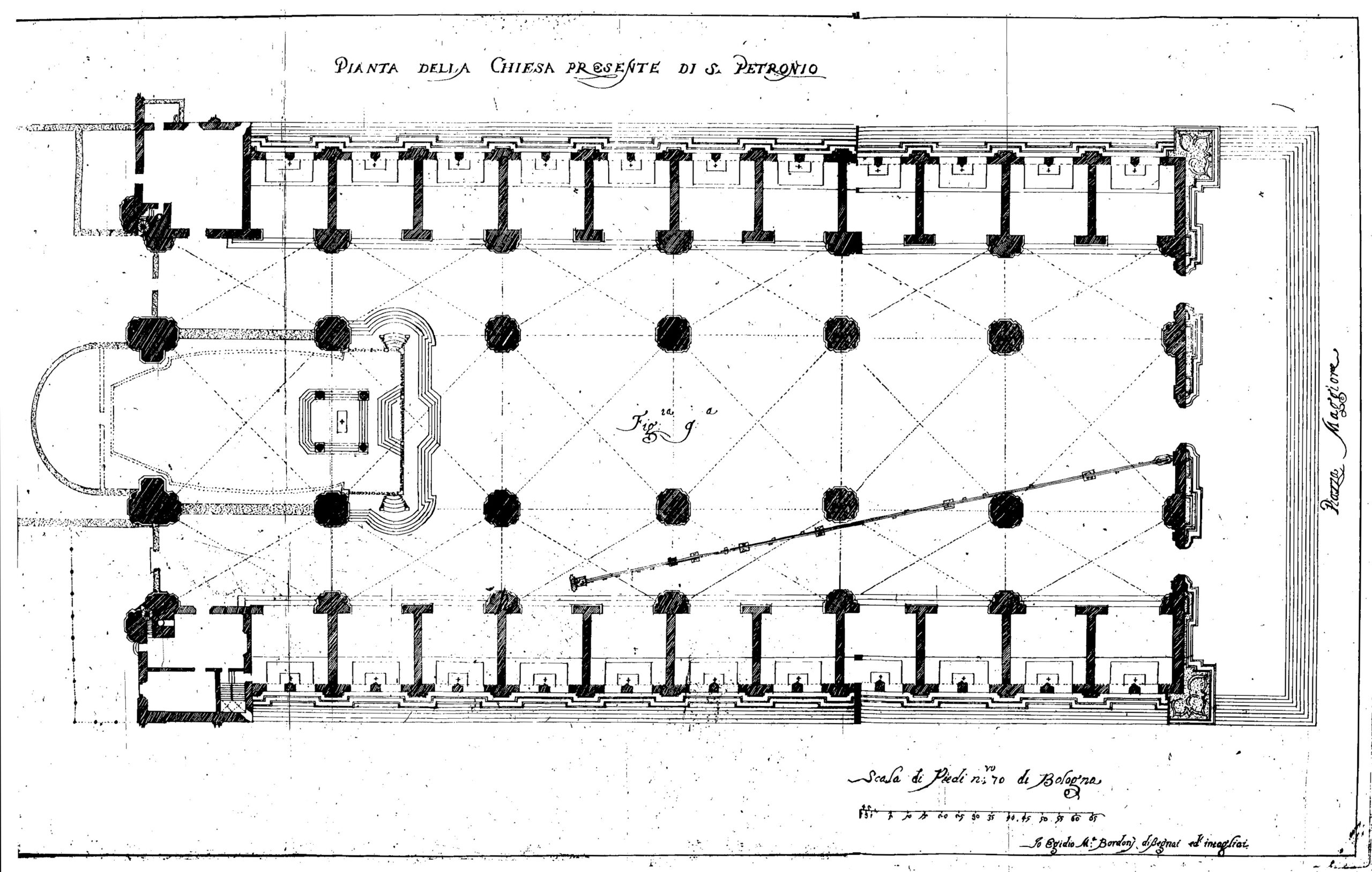Ensimmäinen piirros San Petronion uudesta viivasta on hävinnyt. Cassini antoi sen lahjaksi kuningatar Kristiinalle, kun Ruotsin hallitsija kävi Bolognassa Roomaan suuntautuvalla matkallaan marraskuussa 1655.