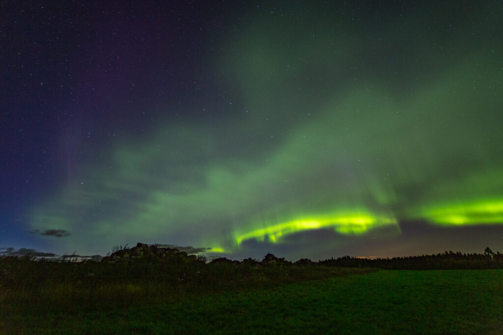 Tässä välissä keräsin kuvausvarusteet ja ajoin autolla kuvauspaikalle parin kilometrin päähän Laustin kylään. Ajomatkalla puhelin alkaa kilisemään kun parkkeerasin autoa peltotielle. Autolta jatkoin reippaasti marssien kohti suota, puhelimen kilistessä jo vimmatusti. Vireenimäiseen juoksuun (eli todella rivakasti etiäpäin) se matkanteko lopulta meni, revontulten syttyessä samalla taivaalle kuin napista painamalla….ja puhelin huusi tässä kohdassa jo hoosiannaa. Nyt on jollain oikeasti asiaa. Äkkiä vauhdissa kännykkä pois taskusta ja huomaan kuvien valinta ketjussa ihmisten pillastuneen.