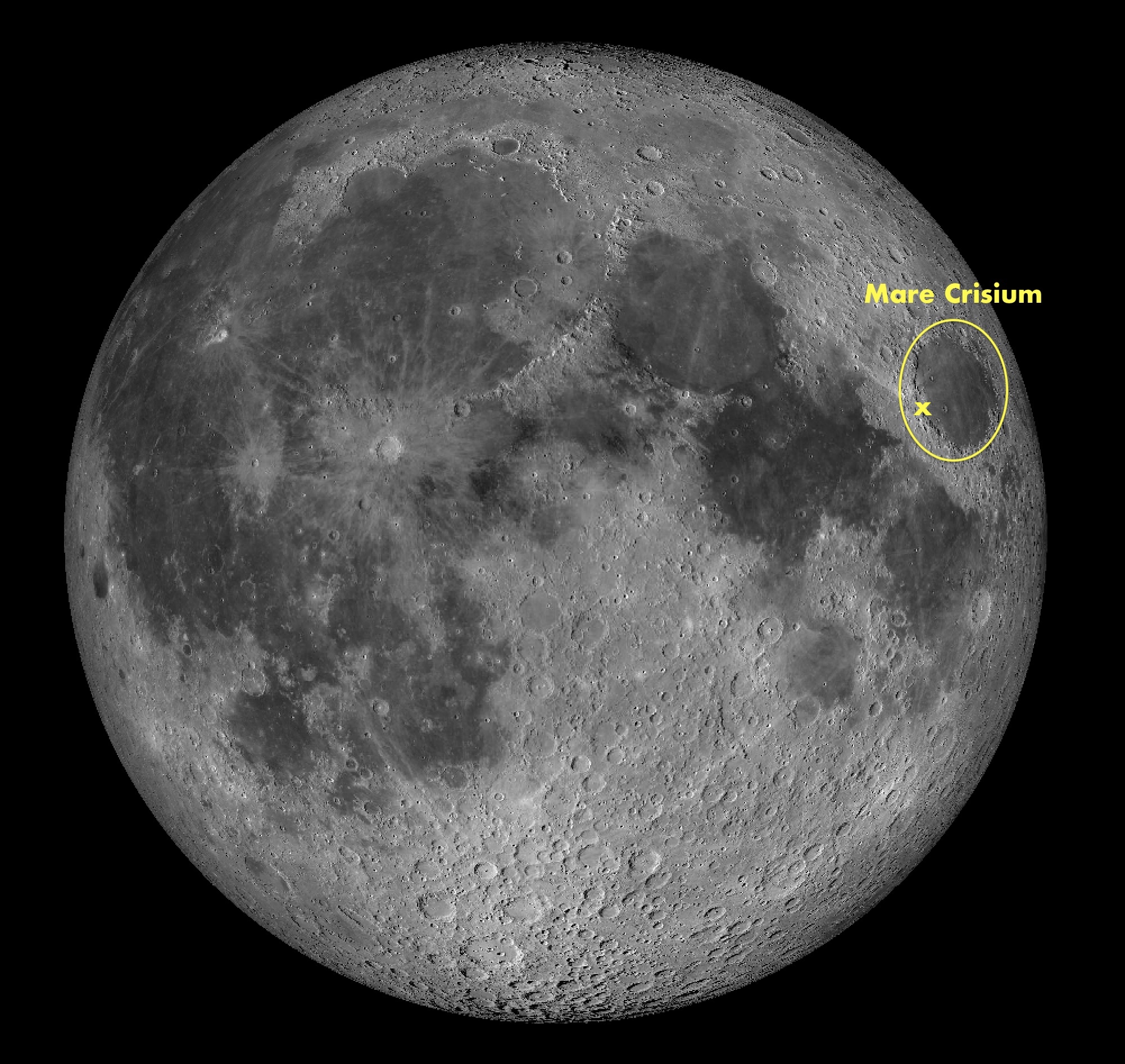 Mare Crisiumin sijainti Kuussa. Alue, jolla O’Neillin sillan voi nähdä on merkitty rastilla. Kartta: Virtual Moon Atlas / LRO WAC / P.C. Wirtanen. Napsauttamalla saat artikkelin kartat ja kuvat suuremmiksi.