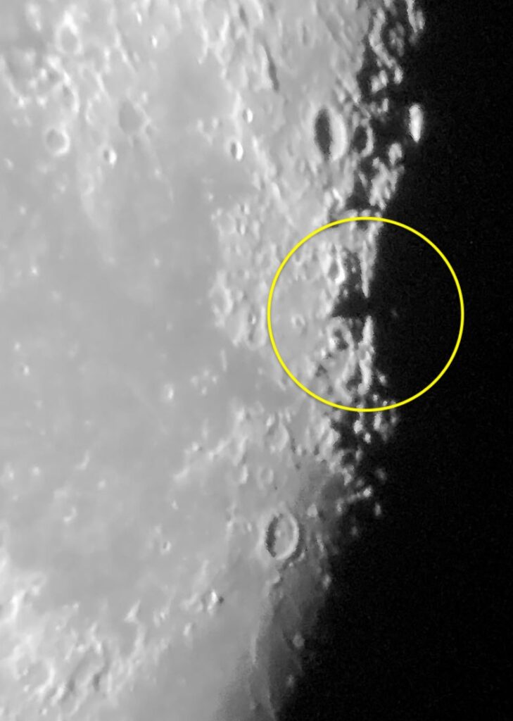 - O’Neillin sillan aluetta 07.08.2020 klo 4.22, kolognitudi 127°. Maksutov 170 mm, Honor 20 Pro. Kuva: Jari Kuula.