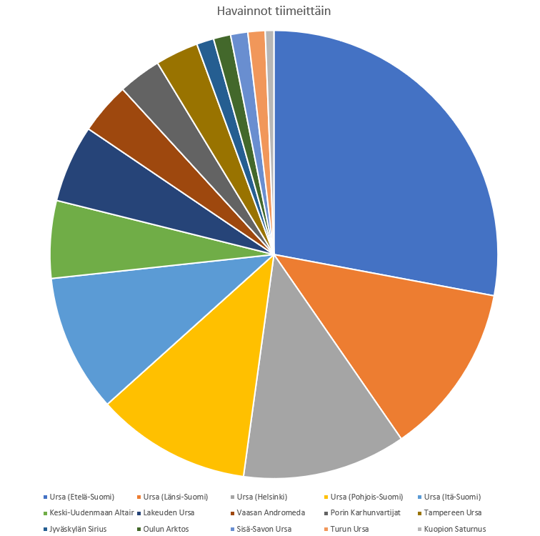 Eniten havaintoja teki Etelä-Suomen tiimi, kakkosena Länsi-Suomi.