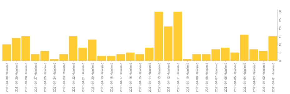 Kaikkiaan havaintoja saapui 271 kappaletta. Ainoastaan päivämäärä 26.4. jäi ilman havaintoa. Eniten havaintoja saatiin yhdestoista ja kolmastoista huhtikuuta, molempina päivinä kolmekymmentä kappaletta.