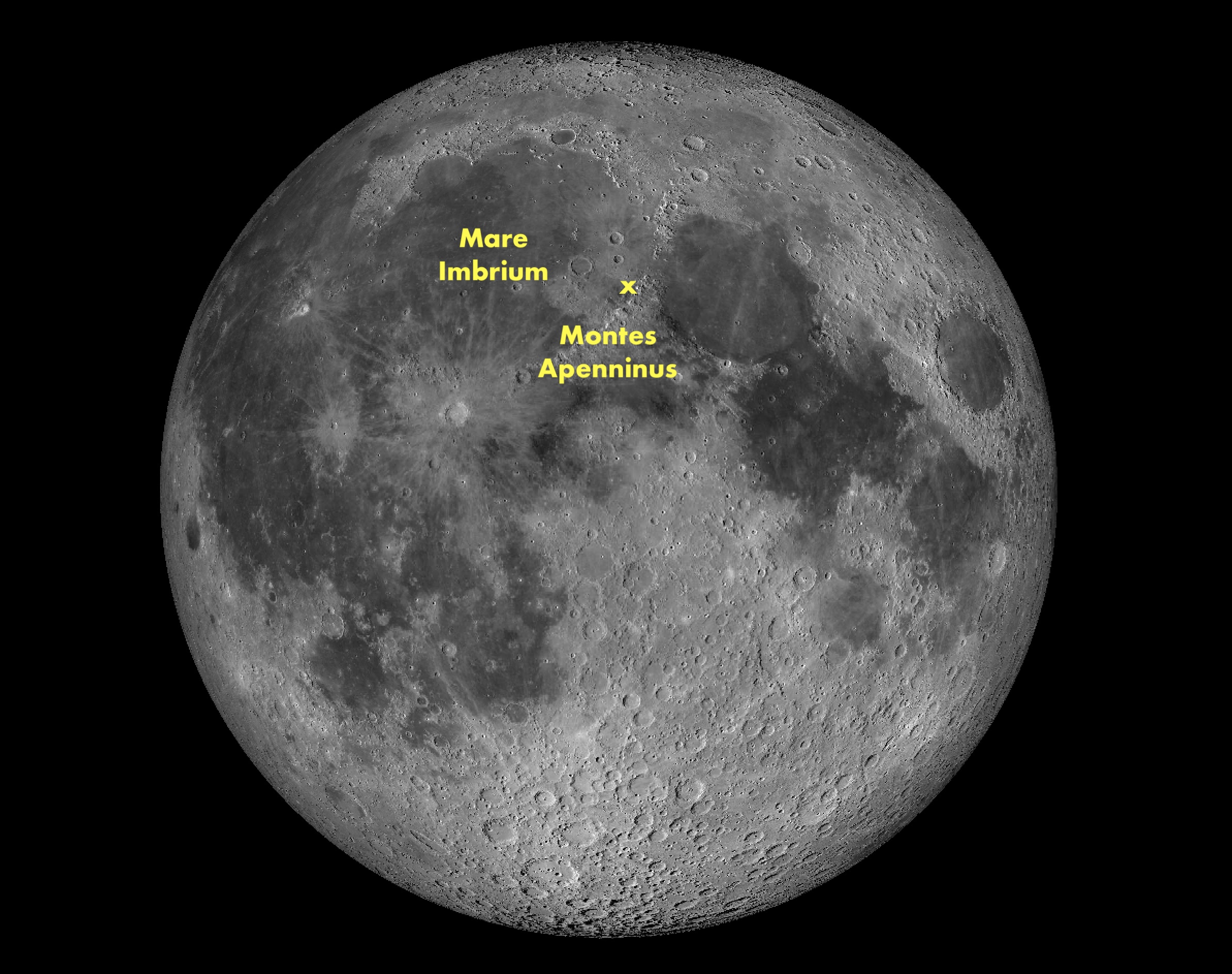 Mare Imbrium on helppo löytää jo paljain silmin hahmottamalla tuttu ”Kuu-ukon naama”. Sitten etsi sen oikea silmä ja – siinä se on! Maren kaakkoisreunaa ylängöstä rajaa poikkeuksellisen suuri vuoristo: Montes Apenninus (suom. Apenniinit). Sen ylitse Apollo 15:n kuumoduuli Falcon liiteli ennen laskeutumistaan vuoriston juurella olevaan laaksoon.