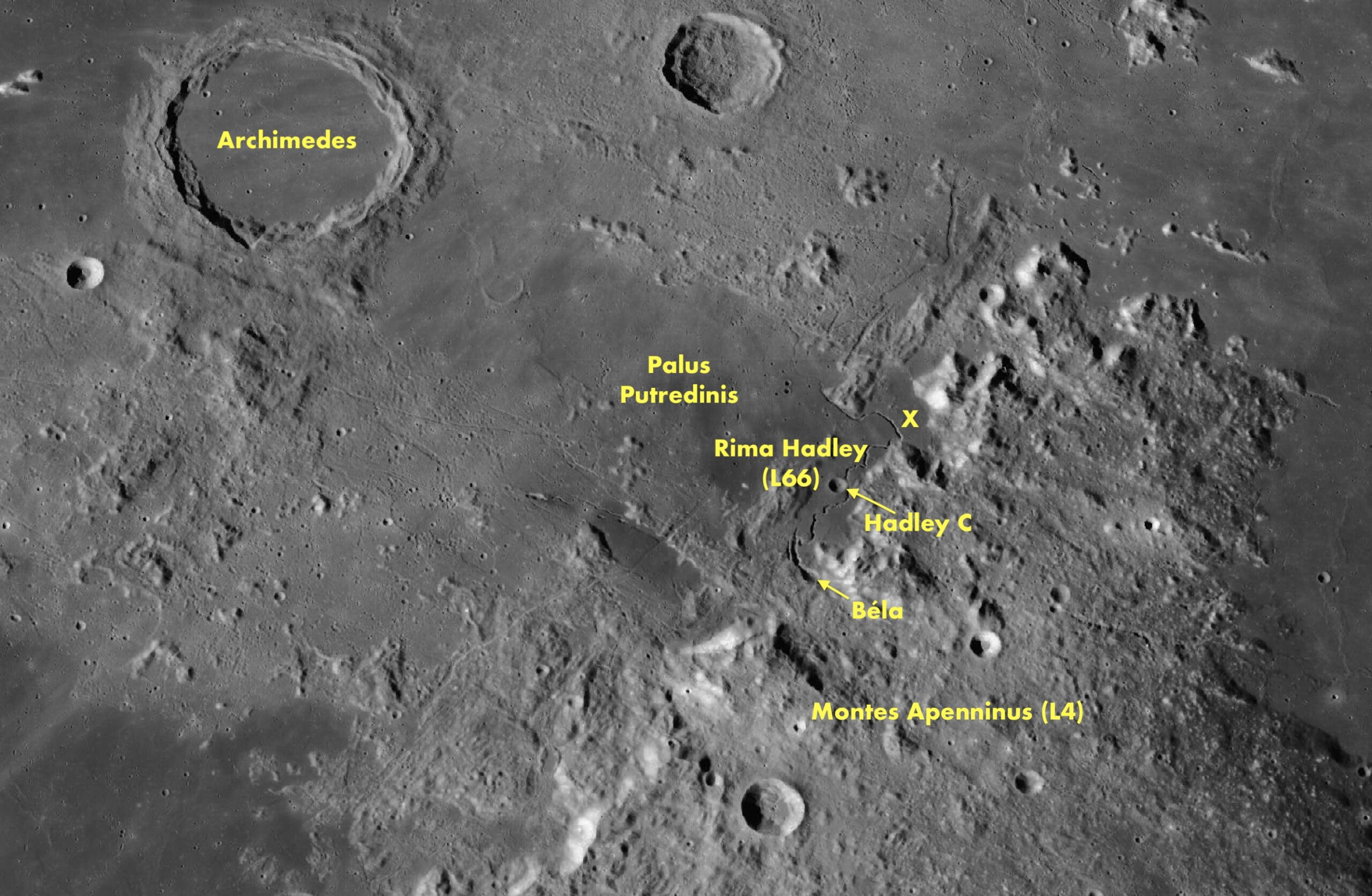 L kohde lat(°) long(°) läpimitta (km) L4 Montes Apenninus 18,9N 3,7W 70 L66 Rima Hadley 25,0N 3,0E -