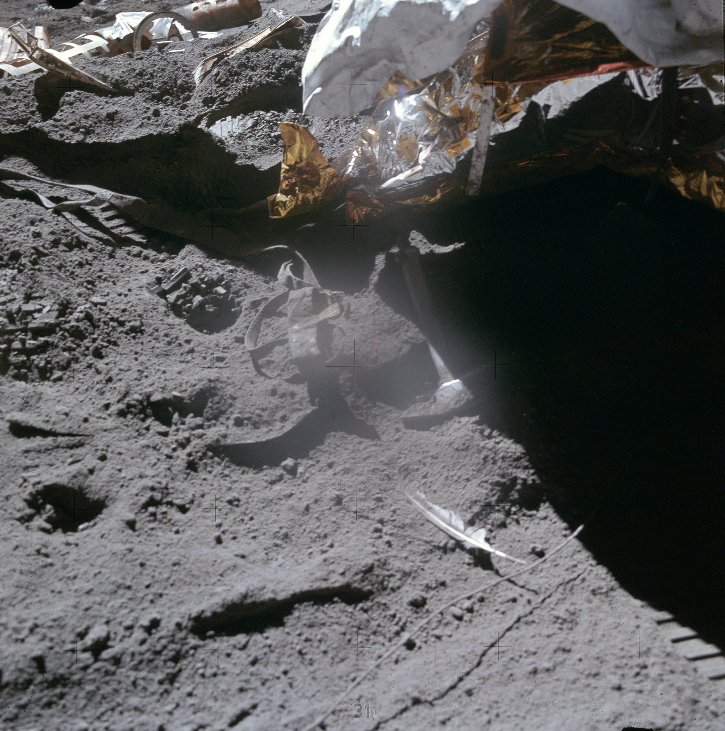 Sulka ja vasara Kuun pinnalla Galileon kokeen jälkeen. Kuva: Nasa / S15-88-11890.