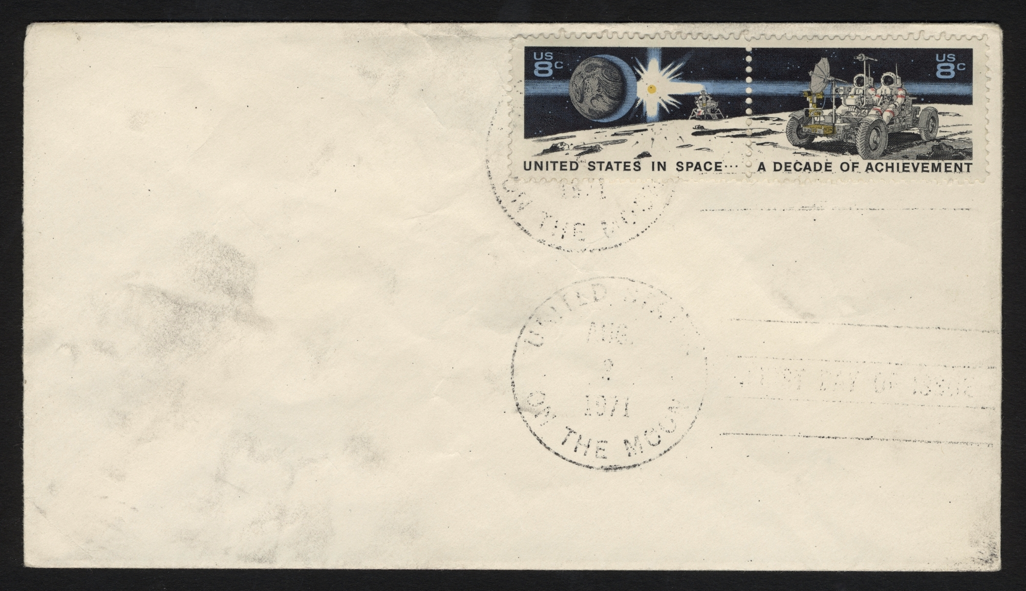 Kuussa leimattu ensipäiväkuori. Kuoren pinnalla olevat ”sormenjäljet” ovat kuupölyä avaruuspuvun käsineestä. Kuva: Smithsonian’s National Postal Museum, Washington DC.