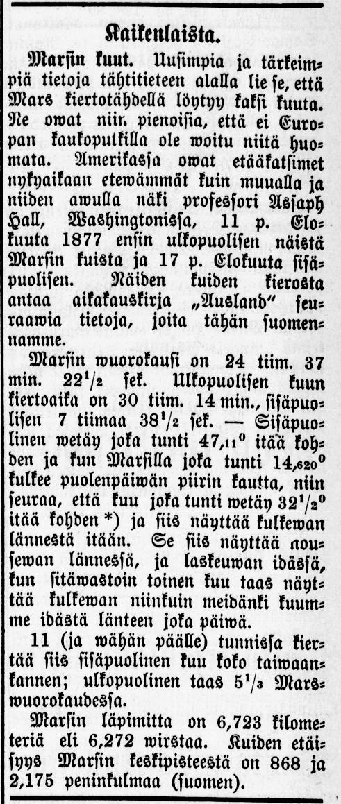 Uusimpia ja tärkeimpiä tietoja tähtitieteen alalla lie se, että Mars kiertotähdellä löytyy kaksi kuuta. Ne ovat niin pienoisia, että ei Europan kaukoputkilla ole woitu niitä huomata. Amerikassa owat etääkatsimet nykyaikaan etewämmät kuin muualla ja niiden awulla näki professori Asaph Hall, Washingtonissa, 11 p. Elokuuta 1877 ensin ulkopuolisen näistä Marsin kuista ja 17 p. Elokuuta sisäpuolisen.