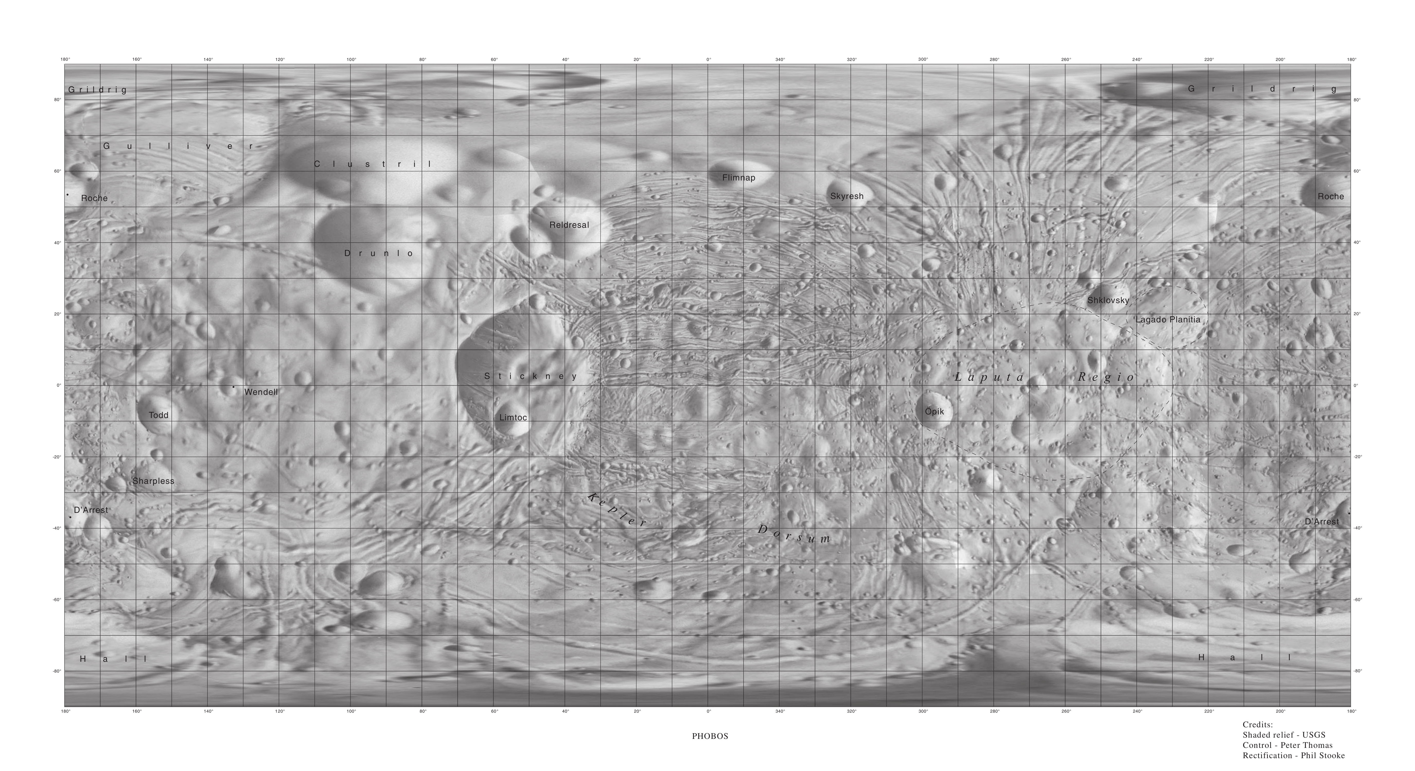 Phoboksen kartta. Stickneyn lisäksi Phoboksen nimistöä on myöskin Hall, Shklovsky, Kepler sekä Gulliver itse ja monet lilliputit. (Yhdysvaltain geologinen tutkimuskeskus USGS)