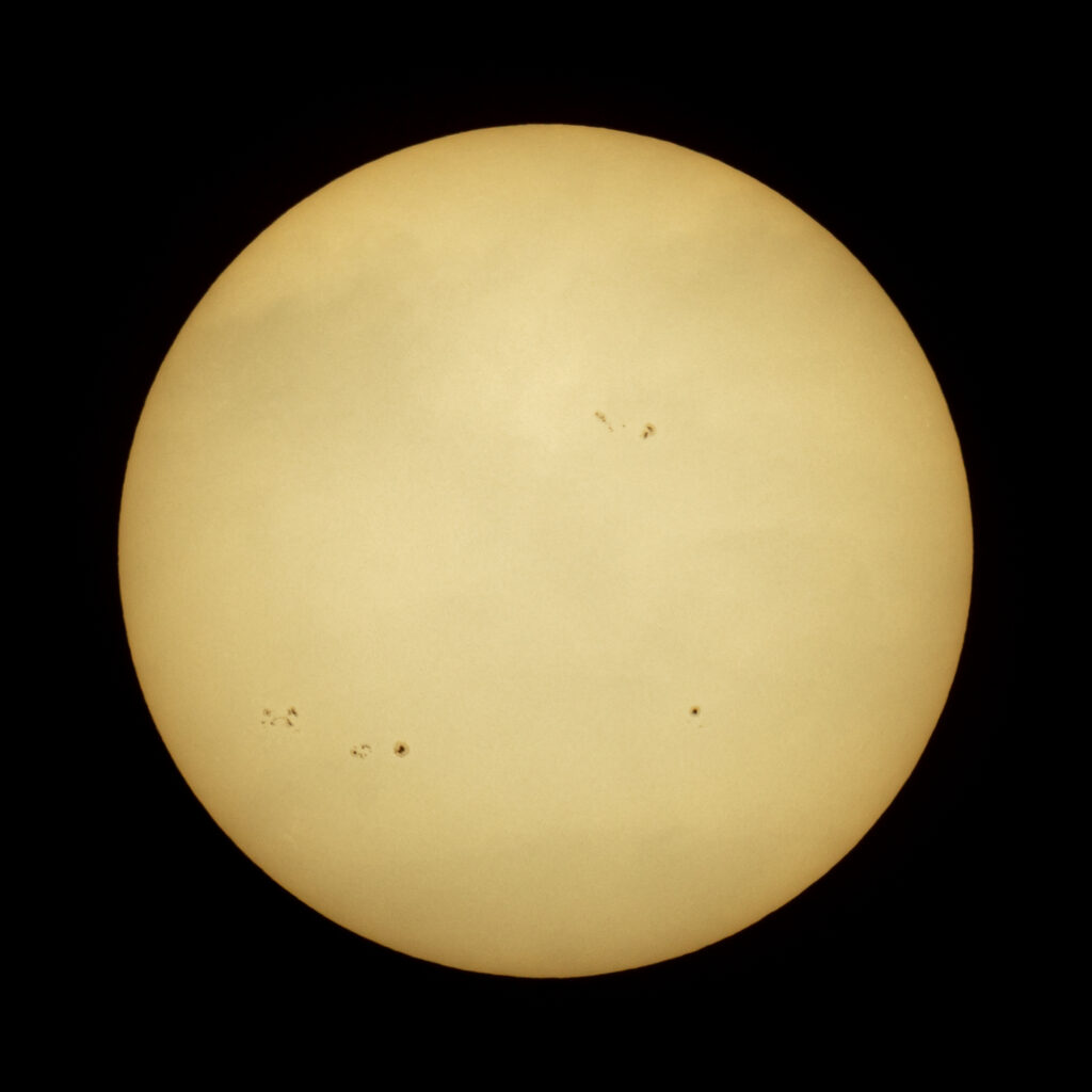 Kaukoputkena oli Sky-Watcher Explorer 200 PDS jonka edessä Baader AstroSolar-aurinkosuodin. Kamerana Canon EOS 7D Mark II kaukoputken polttotasossa, yksittäiskuva (1/2500 s, ISO 200). Värjätty kellertäväksi Lightroomilla.