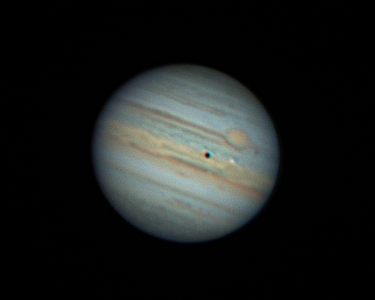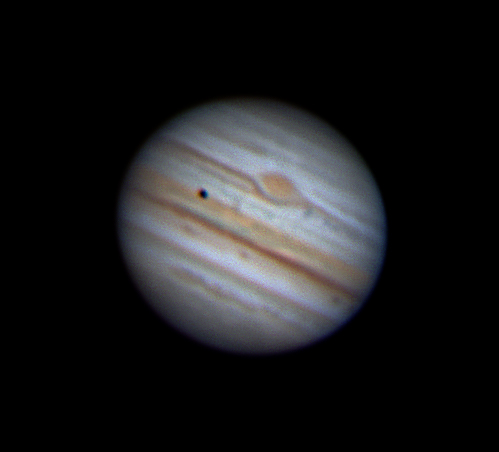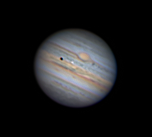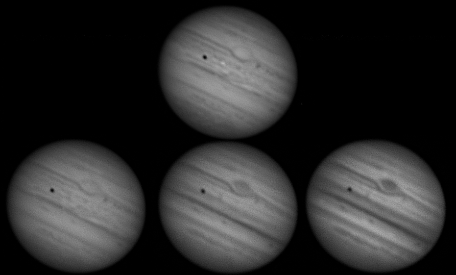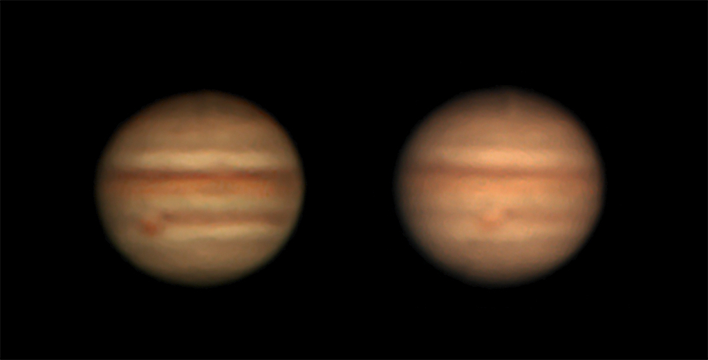 Io varjoineen kulkee Jupiterin editse. Myös suuri punainen pilkku on esillä. Jupiter RGB-kuvassa klo 2.40. Toinen kuva samasta, mutta infrapunakanavan kuvalla terästettynä.