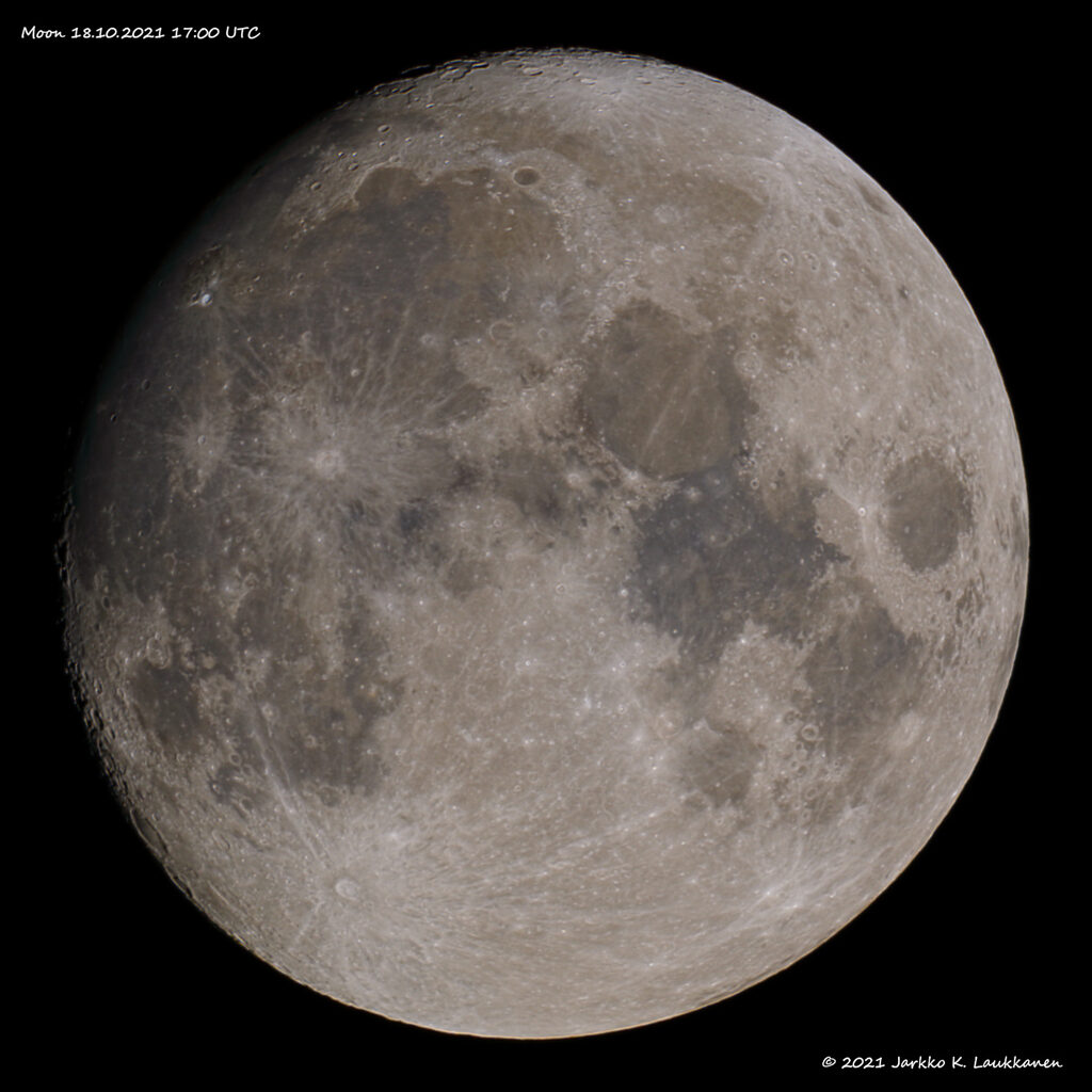 Kamerana oli Canon 77D. Arvot: 1/400 s @ ISO 100. Kuvaan pinottu 12 ruutua ja editoitu GIMP+ Astra Image. Sinertävänä näkyvät alueet Kuun pinnalla ovat paljon titaania sisältävää ainesta.