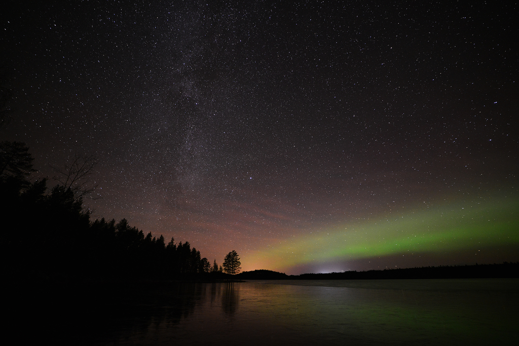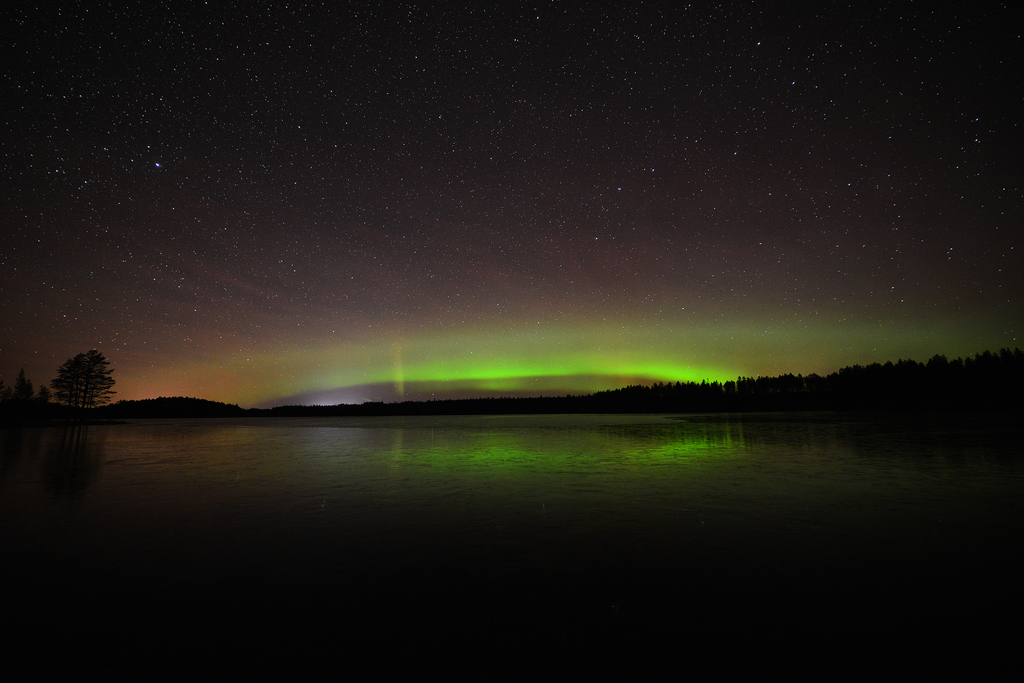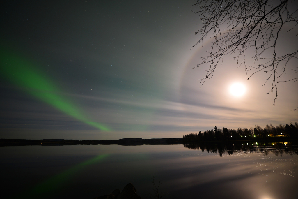Kuvat otettu järven rannalta ja käytetty iso 100. Revontulet olivat tässä vaiheessa kirkkaat ja vihreän värin näki kilpaa kuun halon kanssa.