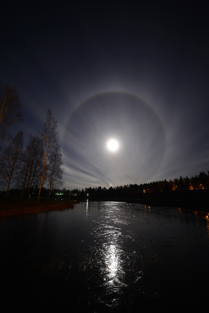 Revontulet ja kuun halo pääsivät ilahduttamaan mukavasti alkuillasta. Kuun siirryttyä korkeammalle, loppuivat myös revontulet.