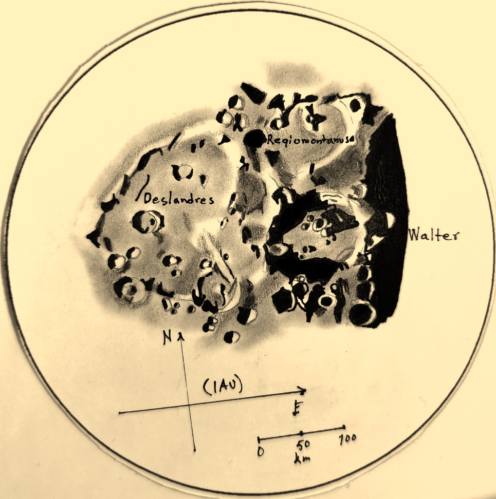 Yritys piirtää Delandres ja pari yksityiskohtaa lähiseudulta. Lexell on syntynyt D:n eteläreunan päälle, 64 km halkaisijaltaan. Tässä valaistuksessa erottuu L:n reunavallin katkoskohdasta (koillisessa) alkava matala kanava, joka ulottuu Cassinin kirkkaaseen täplään saakka.