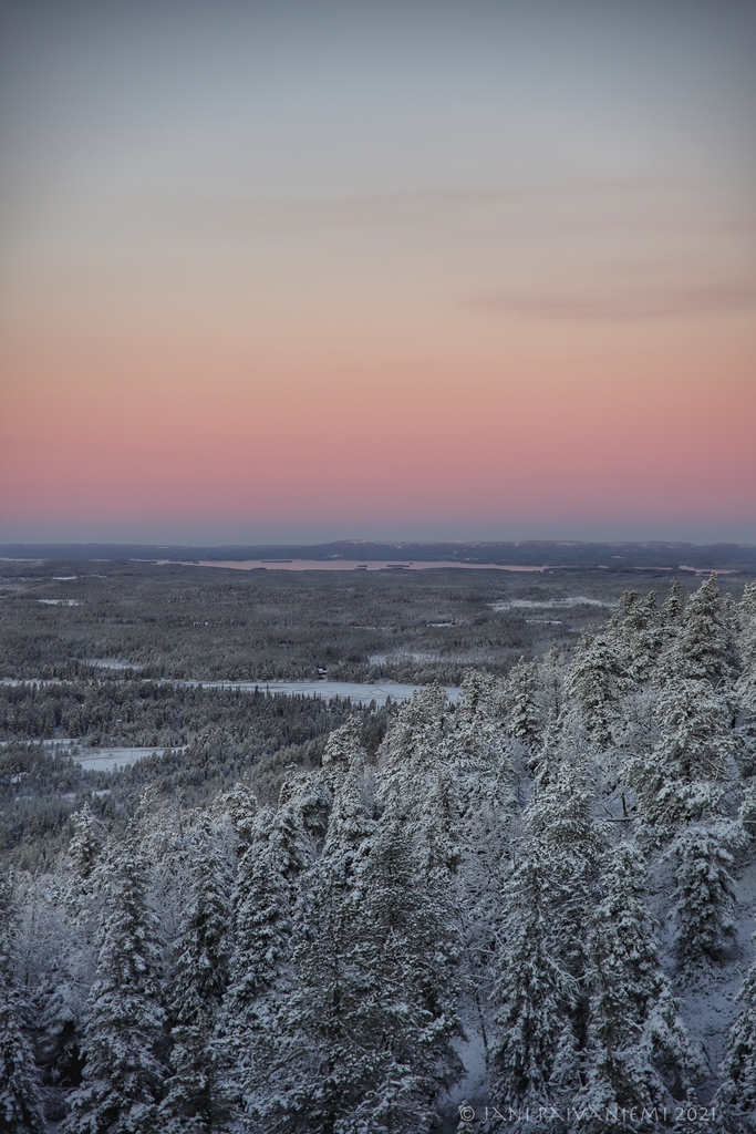 Jani Päiväniemi kuvasi Maan varjon kauniin, talvisen maiseman yllä.