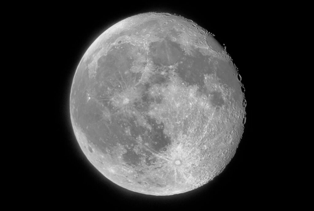 - Kuu 21.11.2021 klo 23.00. Newton 600/2400, APM 1,5× komakorjaava Barlow, kamera ASI183MM, Baader IR-pass -suodin. Kuva: Ari Haavisto.