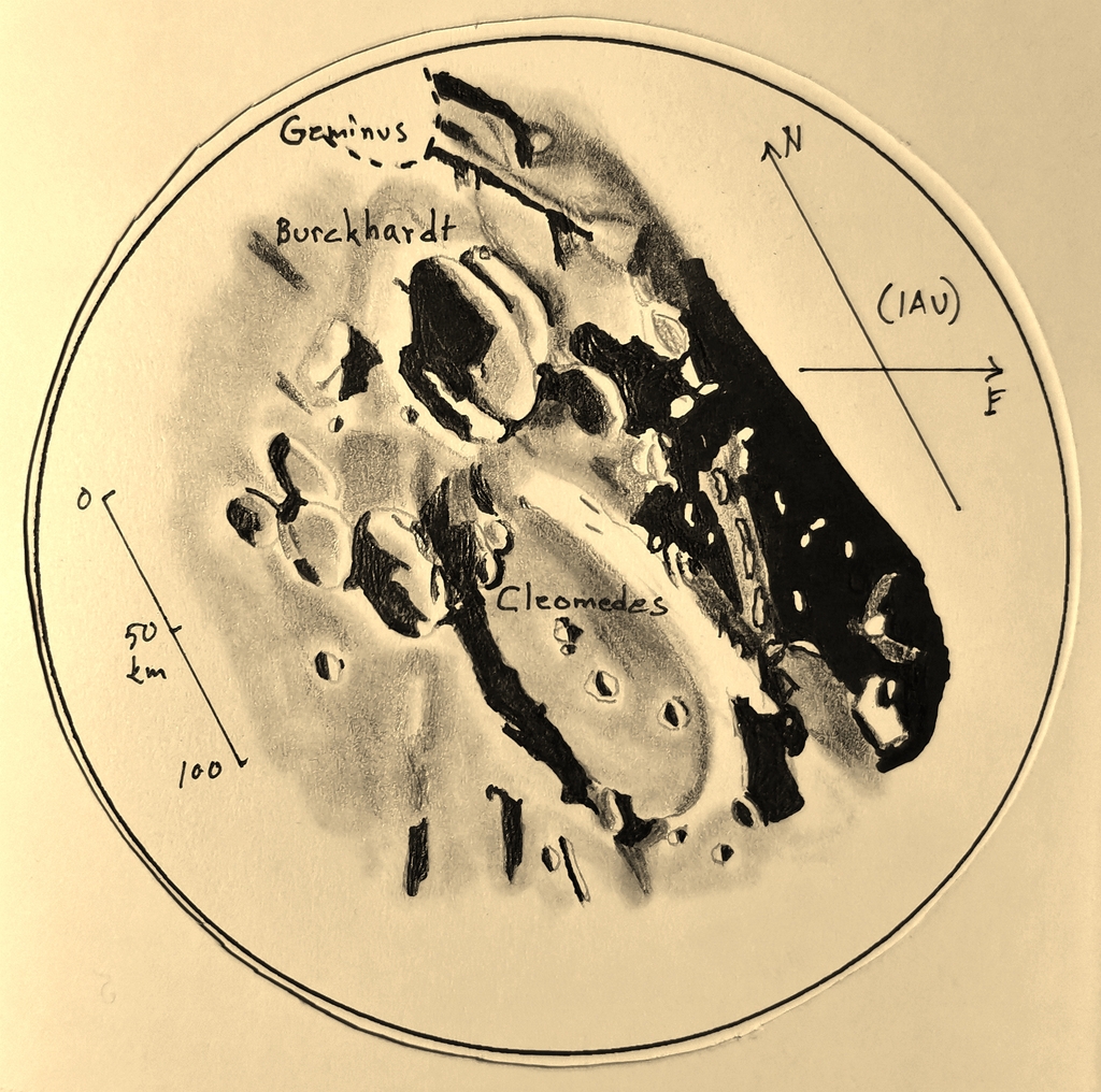 ”Havaintokeli oli marraskuiseksi todella hyvä! Cleomedeen pohja on selkeästi kupera, ja luoteisreunaan osunut Tralles on työntänyt massoja ison kraatterin pohjalle. Cleomedeen kolmihuippuinen keskusvuori nousee melkein kilometrin korkeuteen. Rima Cleomedes ei erottunut piirrettäväksi saakka, sen sijaan saman suuntainen Rima Burckhardt erottui hyvin. Jälkimmäinen alkaa Geminuksen eteläreunasta. Burckhardtin tunnusmerkkinä on sen korvat, kaksi vanhempaa kraatteria on jäänyt keskisesti sen alle.”