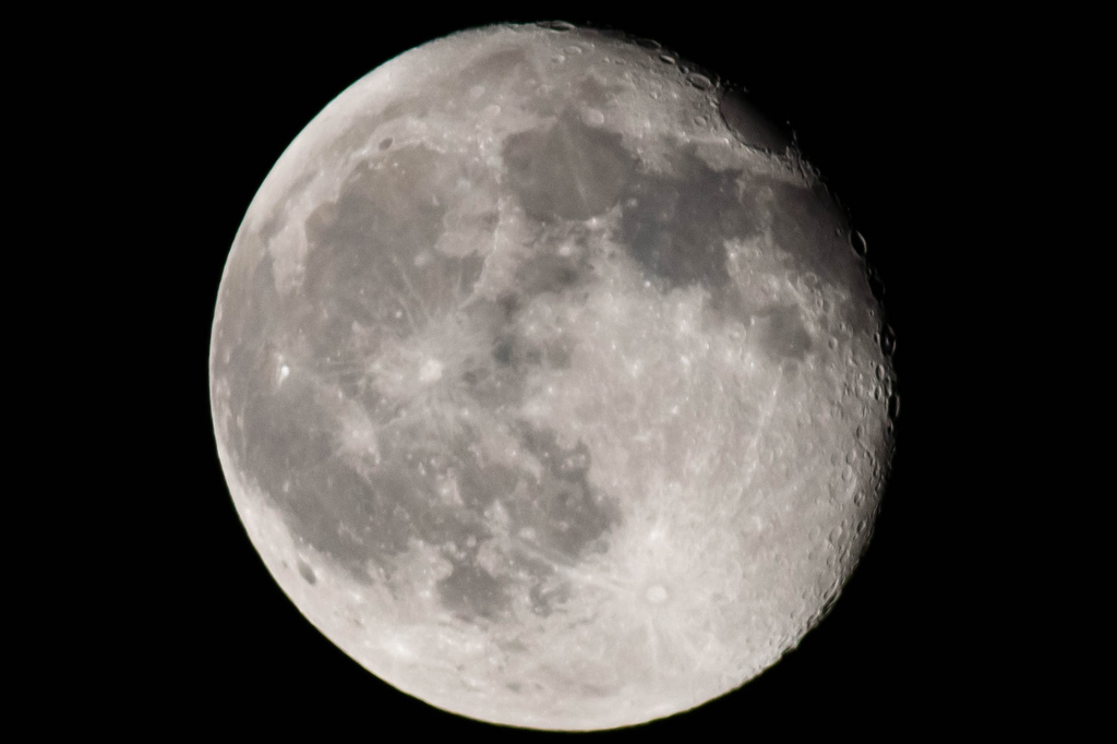 - Kuu 21.11.2021 klo 21.41–42. Kuvattu okulaarin lävitse 37-kertaisella suurennuksella, viiden kuvan pino. Kaukoputki M127/1500, okulaari 40 mm. Kuva: Paula Wirtanen.