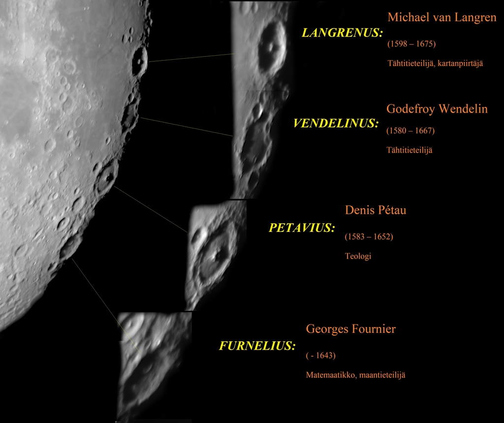 Sekä Poutasen että Puistovaaran kuvassa kraatterinelikon ylimmän (Langrenuksen) pohja on osittain varjossa ja Petaviuksen keskusvuori heijastaa reunavallien alaosaan yltävän varjon. Vendelinuksesta erottuu yksityiskohtia.