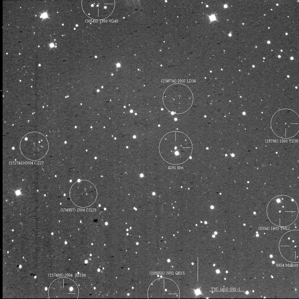 Kuva 11. 4181 Kivi, Yrjö Väisälän 24.2.1938 löytämä päävyöhykkeen keskiosan asteroidi, kantaa kirjailija Aleksis Kiven nimeä. Kari Laihian, Hannu Määttäsen ja Oscar Kambiselisin havaintoryhmä otti asteroidista kuvan 16.3.2018. Kohde on kooltaan 8,3 km ja kuvausaikaan sen kirkkaus oli havaitsijoiden mittauksen perusteella 15,8 mag. Havaitsijat tunnistivat kuvasta myös useita himmeämpiä asteroideja: 6824 Mallory (18,0 mag), (8394) 1993 TM12 (17,4 mag), (15796) 1993 TZ38 (17,7mag), (38549) 1999 VG48 (19,1 mag).