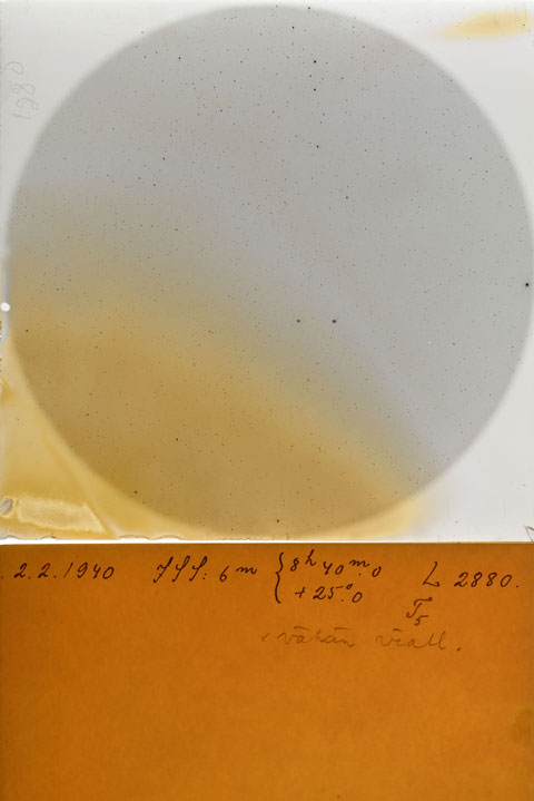 Kuva 3. Tyypillinen Iso-Heikkilässä kuvattu lasilevy. Tässä kuitenkin yksittäisvalotus marraskuusta 1938. Tarkasteltava kohde on ympäröity. Kuva: Tuorlan observatorio.