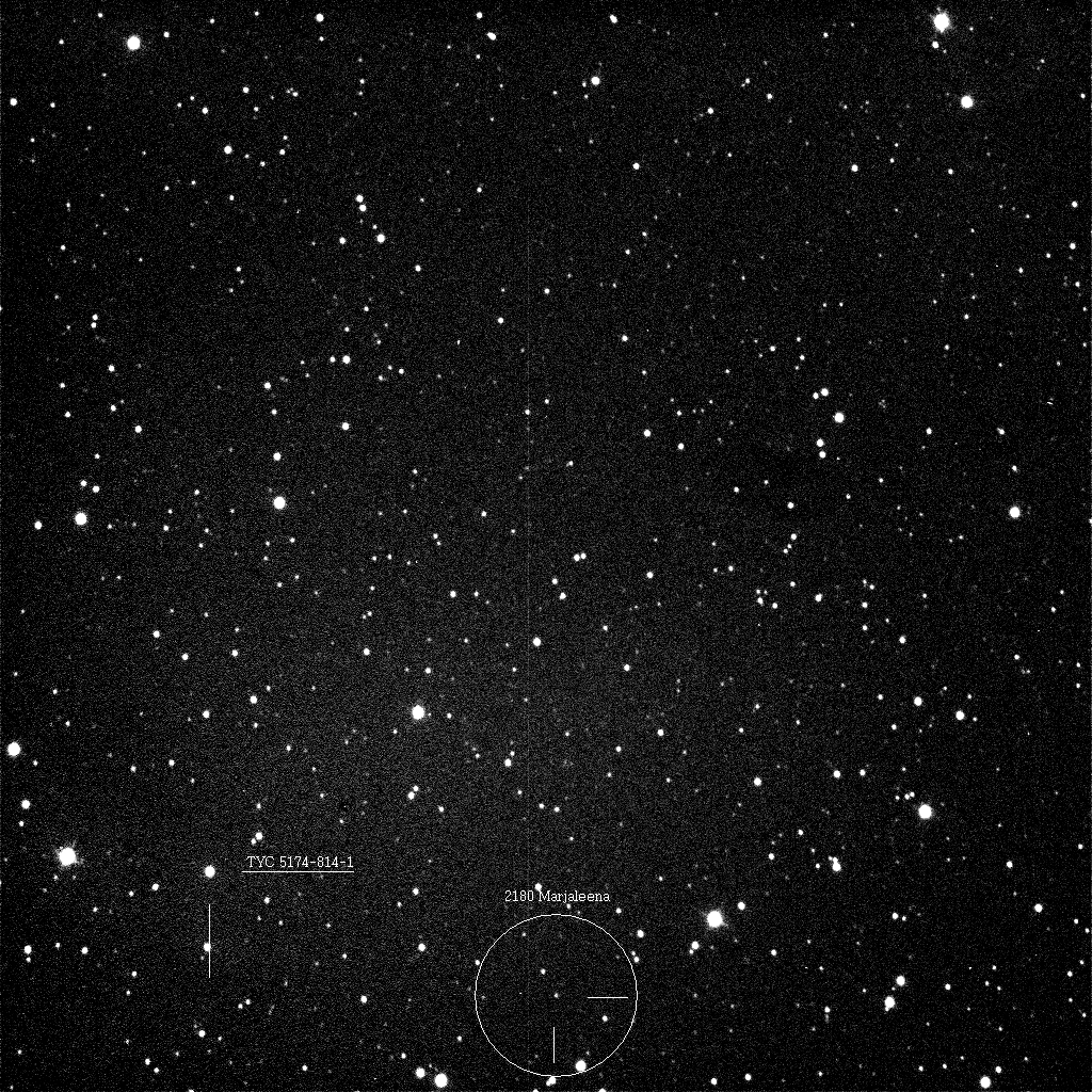 Kuva 4. 2180 Marjaleena. Suomalaisten asteroidilöytäjien joukko on kapea. Yrjö Väisälän ja Liisi Oterman kultakaudella pakkaa sekoitti Heikki Alikoski, joka teki havaintonsa 8.9.1940 Iso-Heikkilässä. Tämä 21,4 kilometrin kohde on nimetty Alikosken tyttären Marja-Leena Johanssonin mukaan. Kohteen kuvasivat Tähtikalliolla Kari Laihia ja Hannu Määttänen 23.9.2018. Kirkkaudeksi he määrittivät 15,7–15,8 mag.