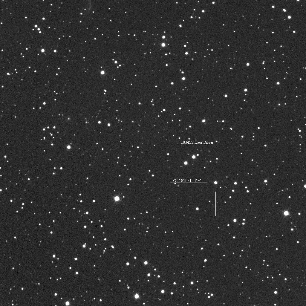 Kuva 6. 103422 Laurisirén on viimeisin suomalaisten löytämä asteroidi. Arto Oksanen ja Marko Moilanen tekivät löytönsä 9.1.2000 Jyväskylän Siriuksen Nyrölän observatoriossa. Nimen pohjana on yhdistyksen perustajajäsen Lauri Sirén. Tämä oli heidän toinen asteroidilöytönsä: he tekivät 14.11.2019 yhdessä Harri Hyvösen kanssa Stella Arcti -palkintoon oikeuttavan löydön kohteesta 22978 Nyrölä. Tähtikallion kameran kennolle Laurisirénin valo pääsi 17.3.2018. Vain 19,9 mag asteroidi on himmein Suomi 100 -projektissa kuvattu. Havaintoryhmään kuuluivat Kari Laihia, Hannu Määttänen, Veikko Mäkelä, Oscar Kambiselis ja Olli-Pekka Joronen.