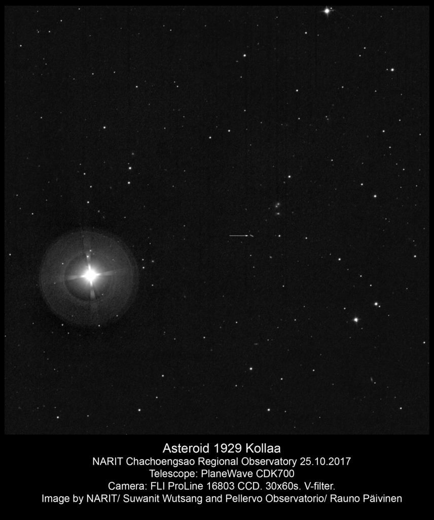 Kuva 7. 1929 Kollaa -asteroidin kuvasivat Rauno Päivinen ja Suwanit Wutsang thaimaalaisen NARIT-instituutin PlaneWave CDK700 -kaukoputkella Suomesta etäyhteydellä 25.–26.10.2017. Noin 6,7 km:n kohde on nimetty Venäjän Karjalassa sijaitsevan sodista tutun Kollaa-joen mukaan. Löytäjänä oli Yrjö Väisälä Iso-Heikkilässä 20.1.1939. Koostumukseltaan kohde muistuttaa Vesta-asteroidia ja sen onkin epäilty olevan peräisin Vestan kuoresta.