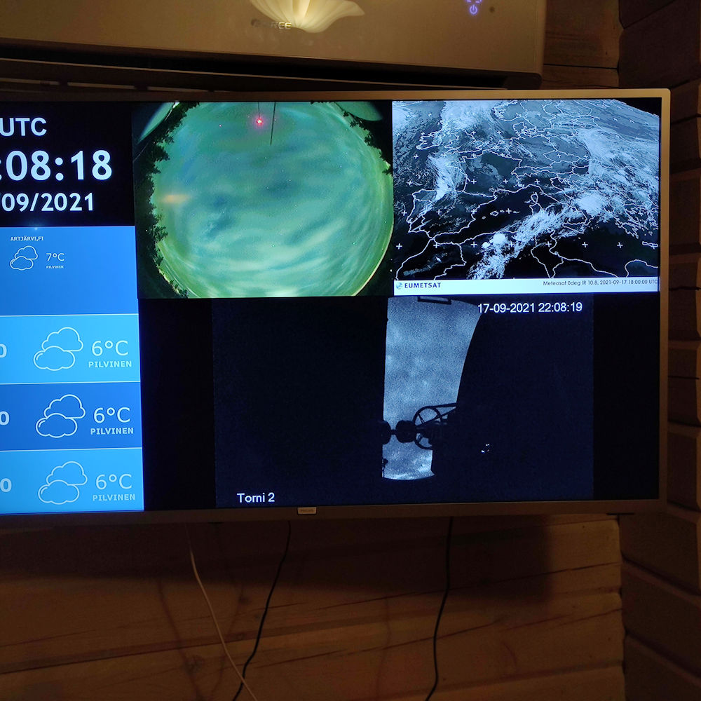 Kuva 8. Sääkään ei aina suosinut kuvaamista Tähtikallion talkooviikonloppuina. Päärakennuksen salin infotaulu näyttää lohdutonta kertomaa. Kuvassa sääennuste lähitunneille, all-sky-kameran kuva, tuorein Meteosat-satelliittikuva sekä kuva kakkostornin luukusta. Kuva: Kari Laihia.