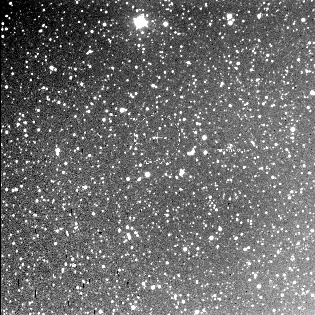 Kuva 9. 1425 Tuorla -asteroidin havaitsi ensimmäisenä matemaatikko ja tähtitieteilijä Kustaa Inkeri 3.4.1937 Iso-Heikkilässä. Kohde kuuluu Eunomia-perheeseen ja on halkaisijaltaan 11,8 km. Nimensä kohde on saanut Turun yliopiston Tuorlan observatoriosta, johon havaintotoiminta siirtyi kaupungin valoihin jääneestä Iso-Heikkilästä. Tähtikalliolla 14.10.2018 kohteen havaintoryhmään kuuluivat Kari Laihia, Hannu Määttänen, Toni Veikkolainen ja Oscar Kambiselis. Kuvaushetkellä asteroidi oli 16,7 mag, joskin taustatähti hankaloitti määritystä, kuten toisinaan voi runsaassa tähtikentässä käydä.
