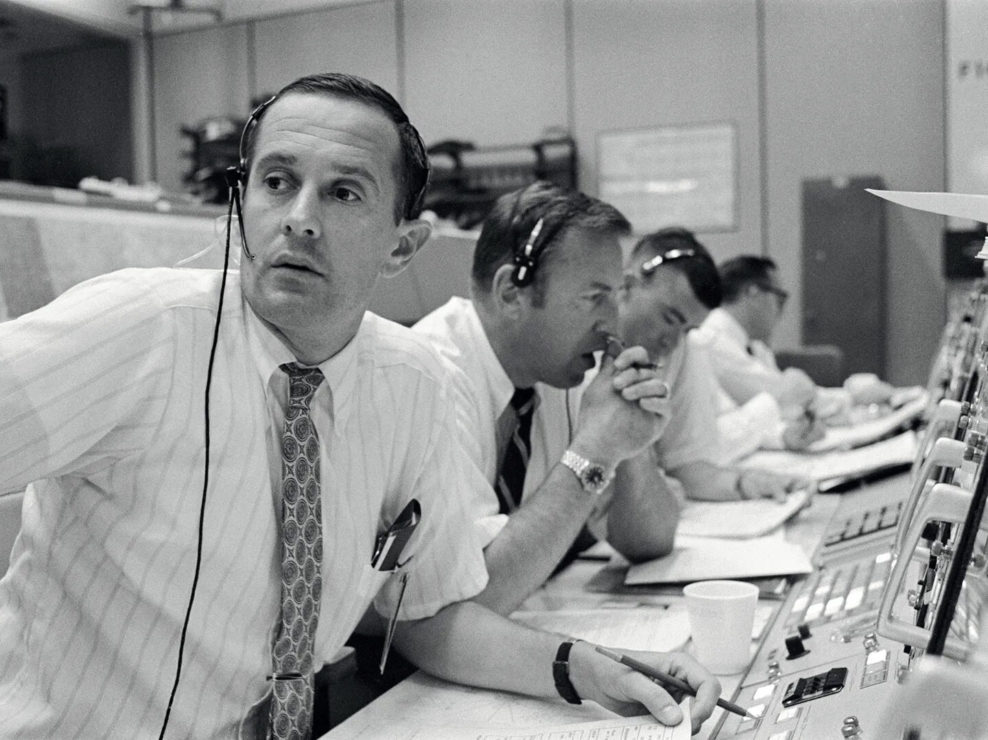 - Charles Duke CAPCOMina Apollo 11:n laskeutumisen aikaan. Hänen vierellään Jim Lovell ja Fred Haise. Kuva: Nasa.
